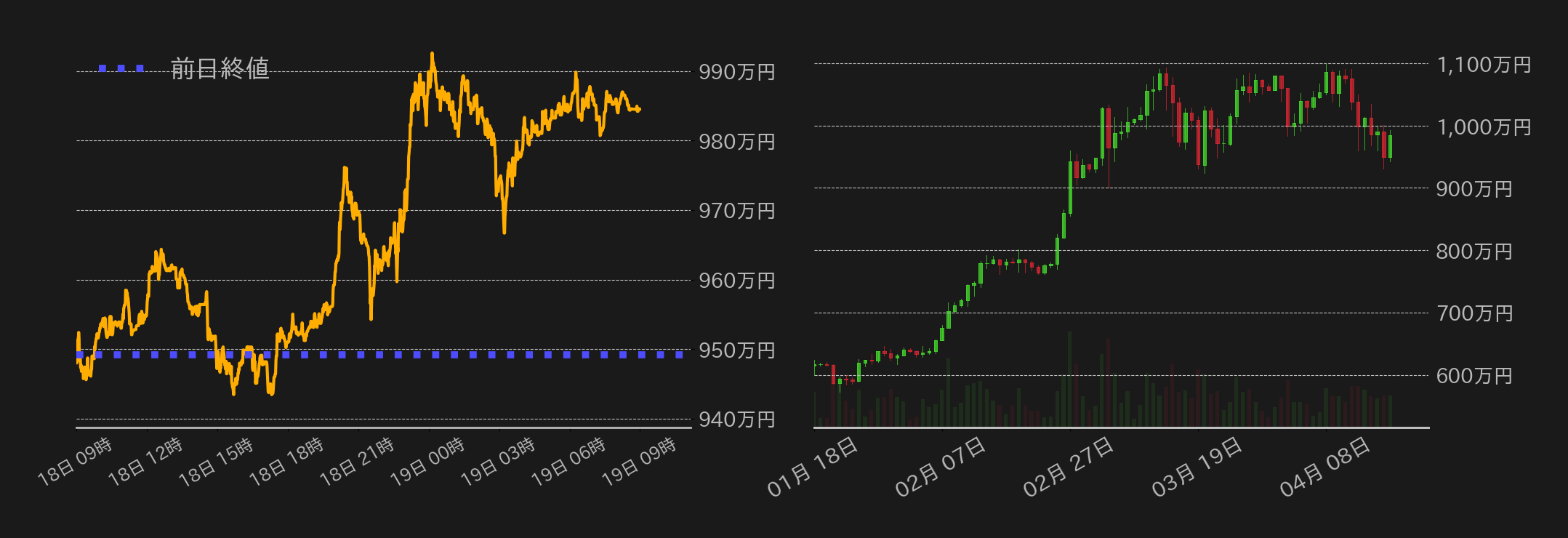 18日のビットコイン(BTC)対円は反発し、前日の下げ幅をほぼ奪回した。BTC円は950万円周辺で取引を開始すると、東京時間は62,000ドル水準(≒962万円)を背に揉み合う展開に終始した。相場は欧州時間に再度62,000ドルを試し上抜けに成功したが、米新規失業保険申請件数が前週から横ばいとなったことで上げ幅を縮小した。しかし、その後発表されたカンファレンス・ボードの景気先行指数の下振れや、「景気が年内に十分に減速する」とのFRB高官の発言を受け、相場は再び反発し990万円にタッチ。これによりドル建てBTC相場が64,000ドルまで戻したことで、その後は失速するも、終値にかけては底堅さを取り戻し980万円台に戻した。