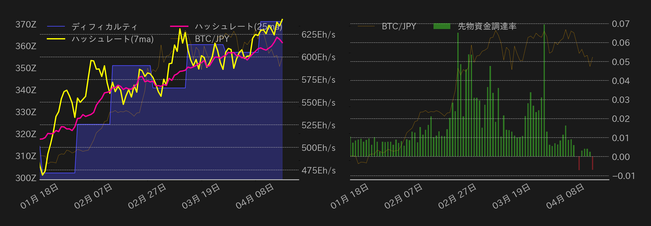 なんとか60,000ドル(≒924.3万円)の最終防波堤を死守して反発したBTC相場だが、足元ではイスラエルがイランに対するミサイル攻撃を開始したとの速報が転がり込み、相場は既に18日の上げ幅を掻き消し、円建てでは930万円台まで下落している。とは言え、ちょうど一週間前から中東情勢の緊迫化が始まり、BTCはある程度の売りが出た後と言え、本日は引き続き60,000ドル周辺が相場のサポートとなるか。ただ、明日に控えた半減期通過後には、ブロック生成時間の延長やハッシュレートの急低下など、ネットワークの不安定化も懸念され、警戒も必要だ。半減期通過直後にBTC相場が上昇したことはなく、週末は60,000ドルを意識した不安定な値動きも想定される。