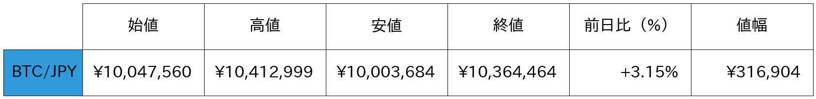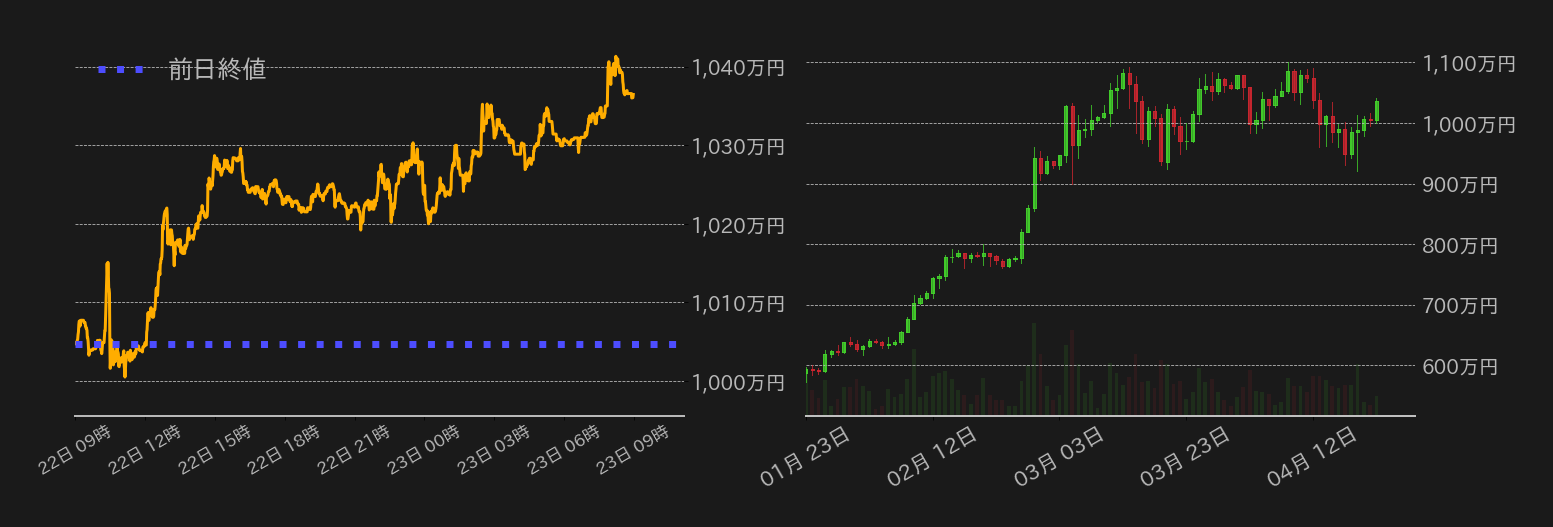 22日のビットコイン(BTC)対円は反発を演じ、今月12日ぶりに終値で1030万円台を回復した。半減期通過後のビットコイン・ネットワークの安定に加え、中東情勢緊迫化のエスカレーション回避期待からこの日のBTC円は戻りを試す展開で取引を始め、東京時間の終盤には1020万円台に乗せた。また、昨日は4月初旬に10億円相当のBTC購入計画を発表していた東証スタンダード上場のメタプラネットが、実際に計画を実行したことを報告したことも好感された。その後、欧州時間のBTC円は失速するも、米国時間に入ると再び上昇。この日の米株式市場では、先週の大幅な株価下落の反動で押し目買いが入り、株価の反発がBTC相場の支援となった格好だ。