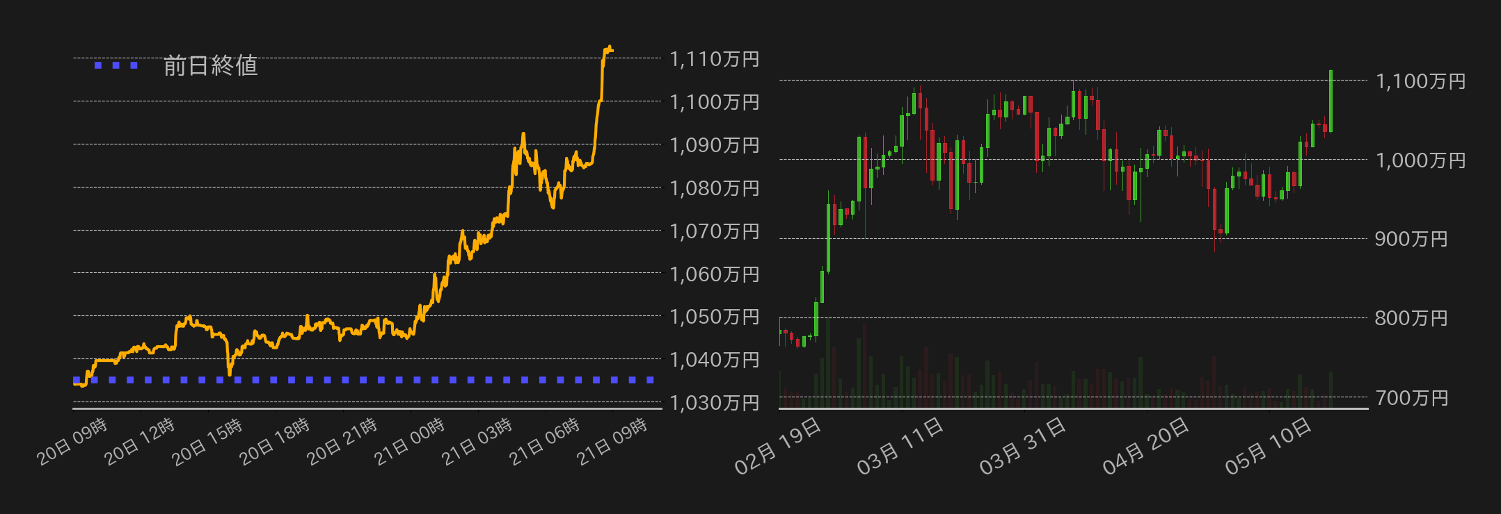 20日のビットコイン(BTC)対円は急伸し、史上最高値の1100万円を更新した。週明け東京時間のBTC円は、概ね1040万円台での揉み合いに終始した。米時間に入ると昨今の現物ビットコインETFの活況さを好感してかコインベースの株価が上昇。また、この日もETFが活況となったことも相場の追い風となり、BTC相場は上値を追う展開となると、引けにかけてブルームバーグのETFアナリストが、米証券取引委員会(SEC)が現物イーサリアムETFを承認する確率を25%から75%に引き上げたことでイーサ(ETH)が急伸し、BTCも連れ高で1090万円にタッチ。終値にかけてはショートを踏み上げて1113万円まで上値を伸ばした。