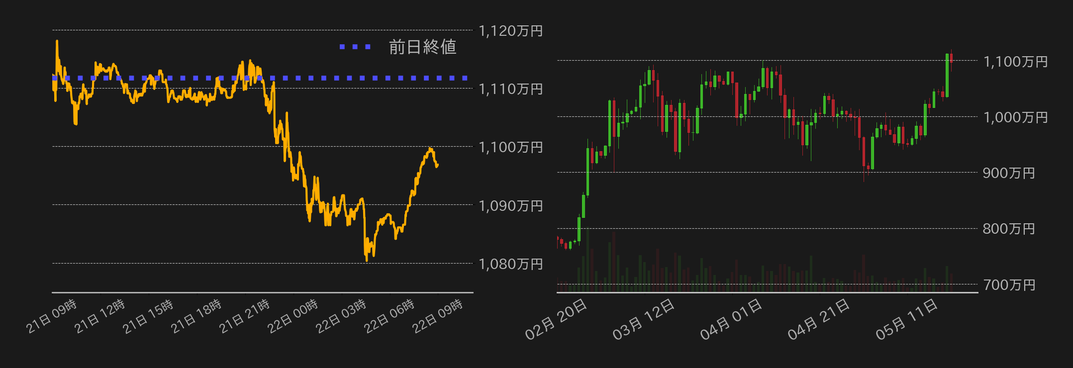 21日のビットコイン(BTC)対円相場は、前日の相場急伸から一転して71,000ドル水準となる1110万円周辺で揉み合う展開で取引を始めた。欧州時間に入るとこの日もイーサ(ETH)が確りとなったが、BTCは高値警戒感から上値を重くしていると、米時間序盤からは売りが加速。昨日の米株式市場は底堅い展開となったが、BTC円は下げ足を速め1100万円や70,000ドル水準となる1093万円を割り込んだ。一方、米市場引け後のBTCには買い戻しが入り小幅に反発し、終値では70,000ドル水準を回復、前日の上げ幅の大半を維持した。他方、ドル建てBTC相場は、前日に中期下降チャネルの上限をブレイクしていたが、昨日の反落でチャネル内に押し返されている。