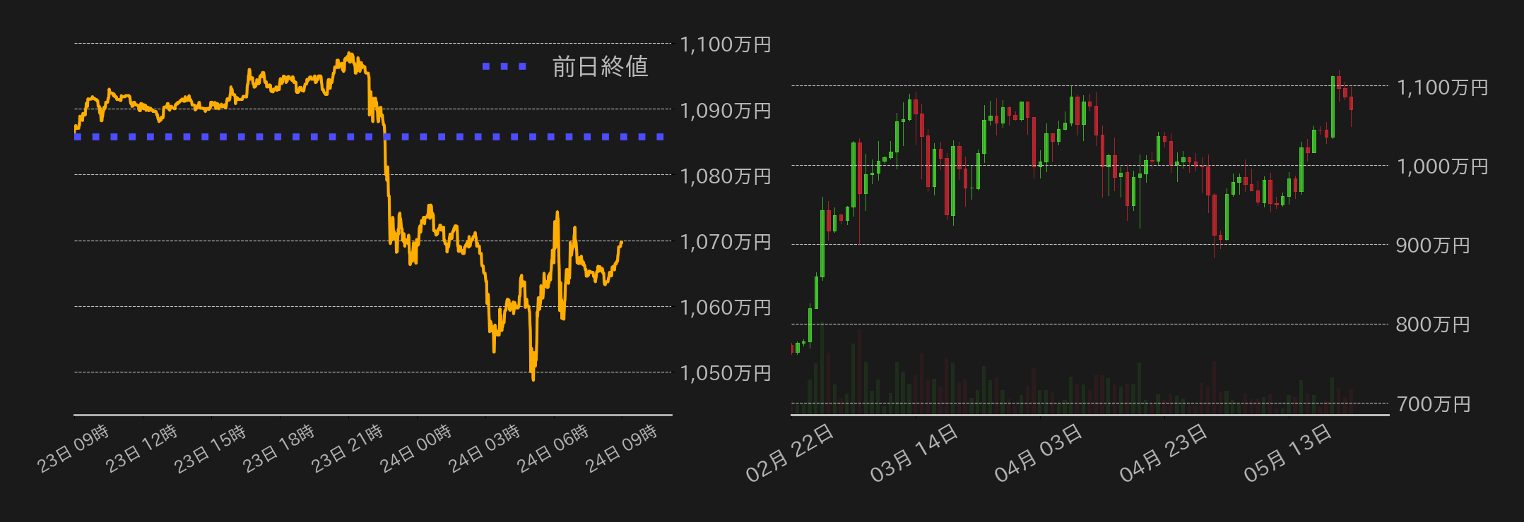 23日のビットコイン(BTC)対円は1090万円周辺での揉み合いで取引を始めると欧州時間には小高く推移し70,000ドル水準にタッチした(≒1099万円)。一方、米時間に入ると、米新規失業保険申請件数の下振れやS&Pグローバルの5月米総合購買担当者景気指数(PMI)の上振れを受けて、相場は1070万円近辺まで一段安を演じた。その後も米株の軟化が重石となり、BTC円は1050万円周辺まで押すも、今朝方には米証券取引委員会(SEC)が申請されているすべての現物イーサETFを承認し、イーサ(ETH)が反発、BTCもつれて1070万円近辺まで戻した。しかし、ETHの反発は一時的なものとなり、BTCの戻りも限定的だった。
