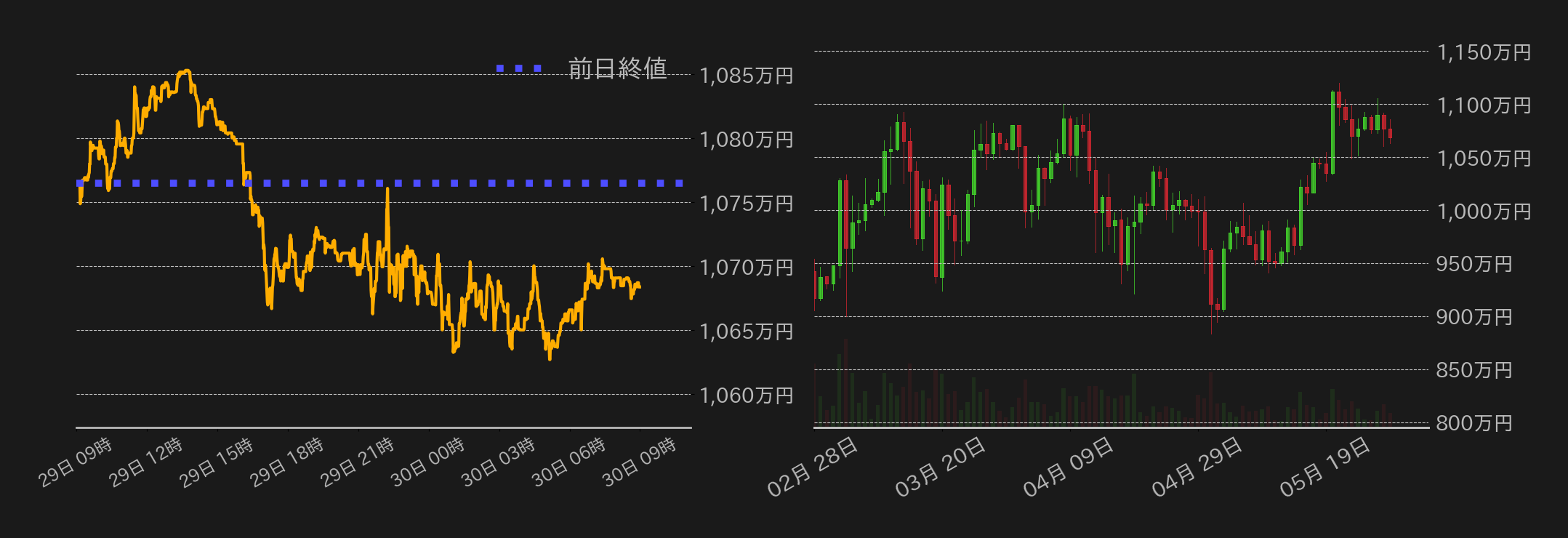 29日のビットコイン(BTC)対円は小幅に続落した。この日のBTC円は1076万円から徐々に戻りを試す展開で取引を始めるも、東京時間に69,000ドル水準となる1085万円にタッチすると戻り売りが入り、1070万円周辺まで反落した。欧州時間に入ると相場は1070万円を挟み込む展開に転じたが、31日の4月米個人消費支出(PCE)価格指数の発表を控え米債利回りが上昇したことで、この日の米市場では主要株価3指数と金(ゴールド)が下落し、BTC相場の上値も重かった。幸い、円建てBTC相場はドルに対する円安の進行に支えられ、前日の安値1060万円を維持したが、ドル建てでは前日安値を切り下げ、短期三角保ち合いの下限(66,850ドル≒1053万円)に一時肉薄した。