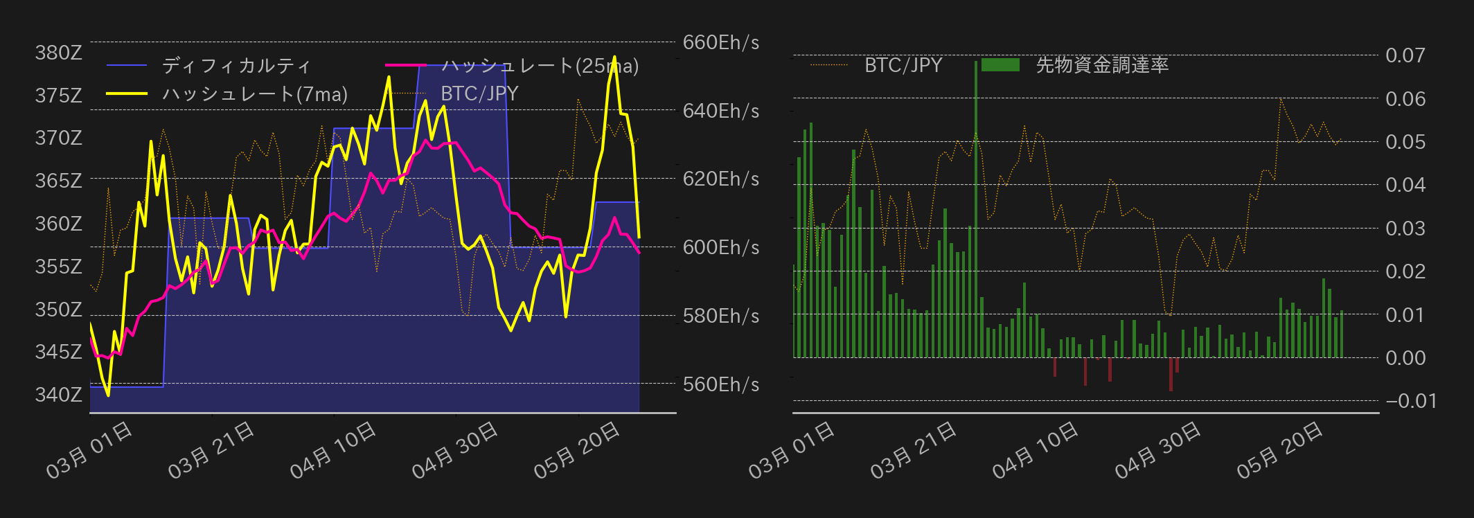 Q1の米コアPCEは予想外の下方修正(+3.7%→+3.6%)となったが、本日発表される4月のPCE価格指数を控えBTC相場への影響は限定的だった。とは言え、相場は週明けに懸念していたほど下落しておらず、今夜の米インフレ指標が4月の米消費者物価指数(CPI)と同様に下振れれば、BTCは続伸し、ドル建てでは3月から続く下降チャネルからのブレイクアウトが視野に入る。ブレイクアウトに成功すれば、BTCは向こう2週間ほどで80,000ドル(≒1254万円)を試すと見ているが、米PCEが上振れとなれば相場は短期間で65,000ドル(≒1018万円)まで下落すると想定している。足元ではビットコインのハッシュレートが低下しブロック生成時間も遅延気味となっており、更なる相場の下落はマイナーにとって相当な痛手となる可能性もあり、今夜の米PCEは中期的なBTC相場の方向感を定める重要な材料となりそうだ。