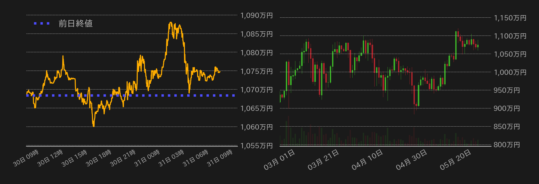 30日のビットコイン(BTC)対円は0.60%高の10,747,276円と小幅に反発した。この日の相場は1068万円から徐々に戻りを試したが、東京時間終盤にかけて上げ幅を解消、欧州時間には1060万円近辺まで下落し、上下に振れる展開を演じた。しかし、相場は67,000ドル水準(≒1051万円)近辺で買い支えられると、米時間には第一・四半期の米GDP成長率やコアPCEの改定値が下方修正されたことを受け反発。さらに、トランプ前米大統領がテスラのマスクCEOと暗号資産(仮想通貨)政策について議論していると報じられ、相場は一時1088万円まで戻した。一方、マスク氏がその後この報道を否定すると、BTCは米市場終盤にかけて反落し上げ幅を縮小した。