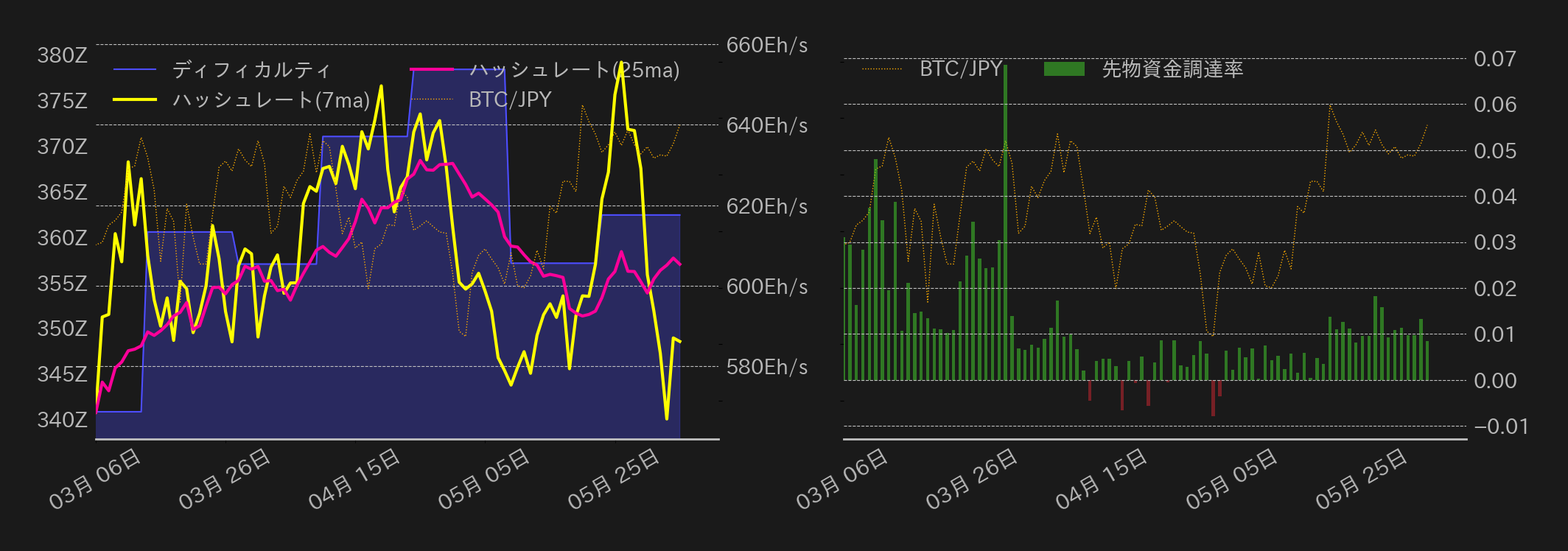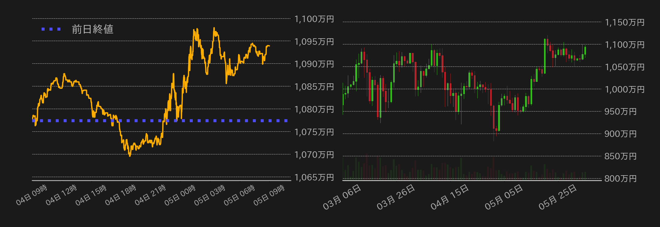 4日のビットコイン(BTC)対円相場は続伸し、およそ2週間ぶりに終値で1090万円を回復した。東京時間のこの日の相場は、1077万円から小高く推移するも上昇一服後に反落し、欧州時間まで小甘い展開が続いた。一方、欧州域内の国債利回りの低下を受けて米債利回りも緩む展開となると、BTCは1070万円で下げ止まり、米時間序盤に反発。その後発表された4月のJOLTs求人件数が下振れると、相場は上値を追う展開に転じ、70,000ドル水準(≒1087万円)や、ドル建てBTC相場の下降チャネル上限(約70,300ドル≒1091万円)の上抜けに成功した。米市場終盤のBTC相場は失速するも、終値では下降チャネルの上限を僅かに上回った。