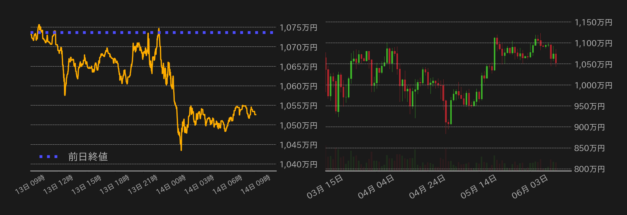 13日のビットコイン(BTC)対円は反落し、およそ1ヵ月ぶりに終値で1060万円を割り込んだ。タカ派的だった米連邦公開市場委員会(FOMC)を通過し、この日のBTC円は1073万円から小緩む展開で取引を開始するも、欧州時間には1060万円台で下げ渋った。その後発表された5月の米卸売物価指数(PPI)が弱めとなると、相場は一時1084万円まで急伸するも、戻り売りに上値を圧迫され反落。寄付きの米株式市場の下落と、米国でイーサETFの取引開始が想定以上に時間がかかる可能性が浮上したことも相場の重石となり、米時間序盤には、相場は1043万円まで押した。一方、その後米株が切り返すとBTCも下げ止まり、終値は1052万円まで戻した。