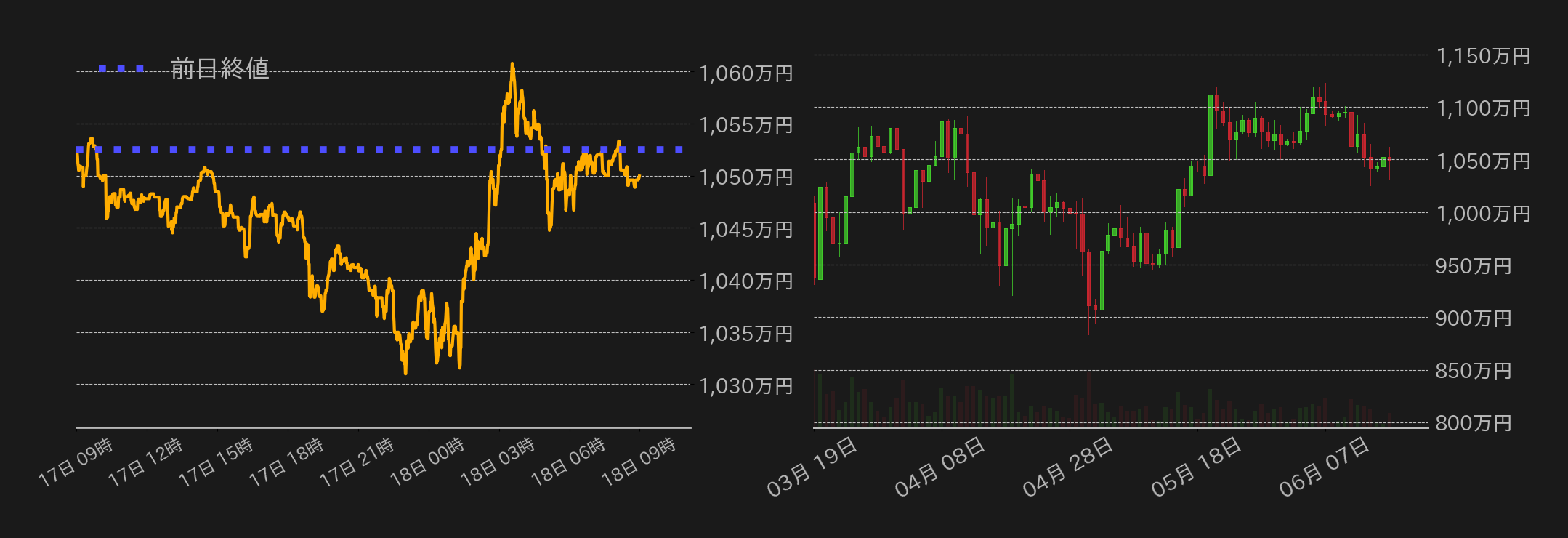 17日のビットコイン(BTC)対円相場は、上値の重い展開で取引を始めるも、終値はほぼ変わらずだった。東京時間から欧州時間にかけてのこの日のBTC相場は、主要アルトコイン相場の下落につれてジリ安となり、欧米国債相場の下落も相場の重石となり、1050万円台から1030万円台中盤まで値を下げた。米時間に入ると、NY連銀製造業景気指数の上振れを受けて、BTCは1030万円近辺までさらに押したが、その後は米株の上昇に連れ高となり下げ幅を解消した。一方、今朝方からは合計で1億9000万ドル(≒300億円)を超えるイーサ(ETH)がコインベースを含む複数取引所に送金されたことが確認され、BTCは失速。本日は取引開始から売りが先行し相場は急落を演じており、1024万円まで下落している。