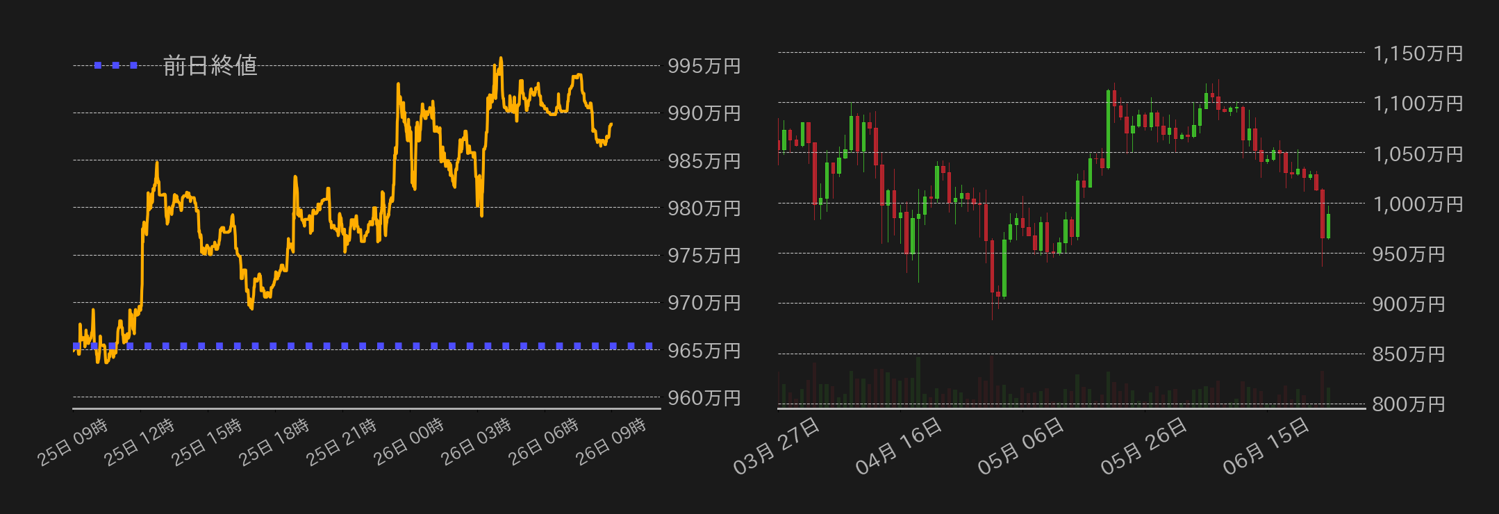 25日のビットコイン(BTC)対円相場は反発し、1000万円回復を試した。前日に60,000ドル水準(≒958.4万円)を一時割り込んだ下値目標達成感から、この日の相場は押し目買いの様相で反発して取引を開始、週末からの下落の半値戻し周辺となる61,500ドル周辺(≒982.4万円)まで戻した。その後は揉み合う展開に転じたが、6月のCB米消費者信頼感指数が2ヵ月ぶりに低下したことや米ハイテク株の反発、さらには米国でBTCでの連邦所得税の支払いを可能にする法案が提出されたことを受けて、BTCは一時62,000ドル水準(≒990.5万円)を回復した。一方、米市場引け後のBTCは失速、終値で上述の半値戻し水準は回復したが、節目62,000ドル周辺がレジスタンスとなった格好だ。