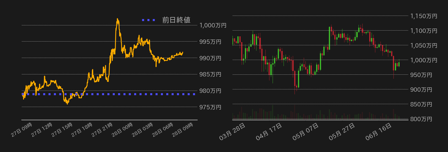 27日のビットコイン(BTC)対円は反発し、前日の下げ幅を奪回した。この日の相場は材料待ちの様相で、米時間に入るまで980万円周辺での揉み合いに終始した。米時間序盤に発表された一連の米経済指標では、第一・四半期GDPが若干上方修正されたものの、前期比では+3.4%から+1.4%と急激な伸びの鈍化が確認され、5月の米耐久財受注のコア指数にあたる非国防資本財が予想の+0.1%に対して-0.6%と大幅に下振れたことで、BTC相場は上昇に転じた。また、ヴァンエックが現物ソラナ(SOL)ETFの登録届出書を米SECに提出し、相場は一時62,000ドル(≒998.7万円)を回復した。一方、その後の相場は失速し、上げ幅をやや縮小した。