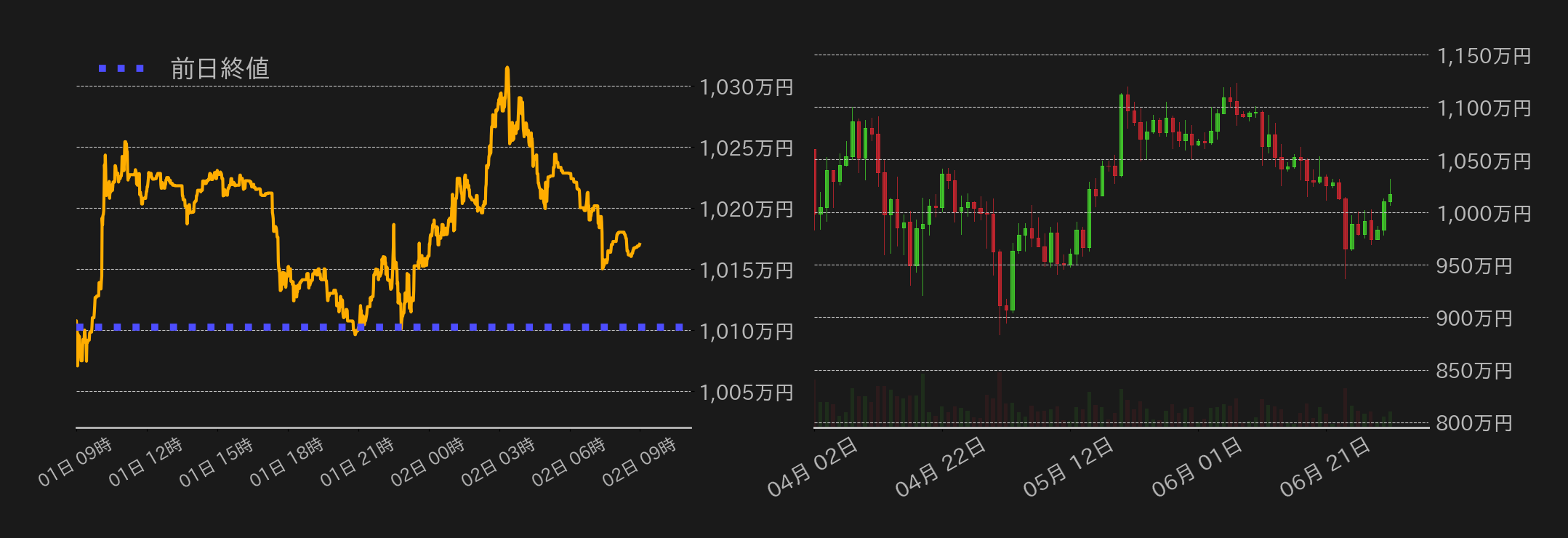 7月1日のビットコイン(BTC)対円相場は小幅に続伸した。30日に行われた仏下院選挙の1回目投票で、極右政党の国民連合(NR)が首位になる見通しとなると、週末のBTCは1000万円を回復、昨日も始値から買われ、1025万円まで上昇した。一方、欧州市場が取引を開始すると、仏国債利回りの上昇を眺めBTCは上げ幅を解消した。米時間に入ると、全米供給管理協会(ISM)が発表した6月の製造業購買担当者景気指数(PMI)が予想の49.1に対して48.5と下振れ、BTCは再度上値を試す展開となり1030万円にタッチしたが、その後は戻り売りが入り終値にかけて上げ幅を縮小した。