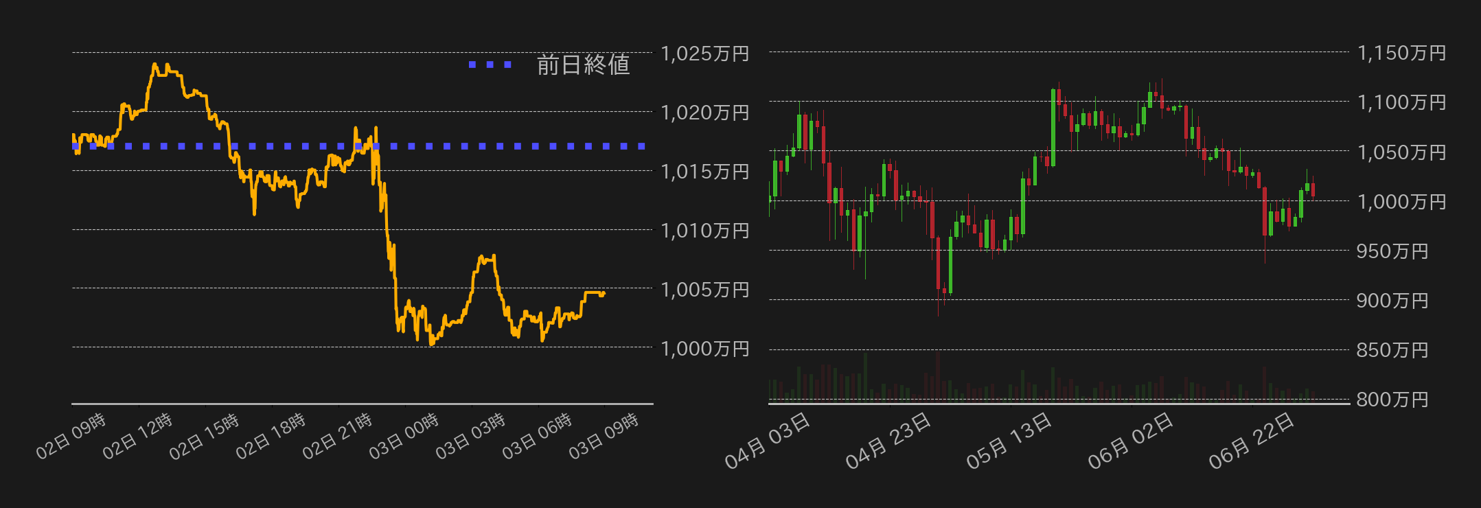2日のビットコイン(BTC)対円は1017万円から取引を始めると、東京時間は小幅揉み合いに終始したが、ユーロや欧州株式市場が序盤に弱含むのを眺め1011万円まで押した。その後、パウエル米連邦準備理事会(FRB)議長が欧州中央銀行(ECB)主催の経済フォーラムで、米国は「ディスインフレの道」に戻ったと発言し、相場は一時小締まるも、その前後でドイツ政府のBTCが動いたことや、5月のJOLTs求人件数が強めにでたことで1000万円近辺まで反落した。一方、この日は米株が堅調に推移したことでその後のBTCは下げ止まり、終値では節目の1000万円を維持した。