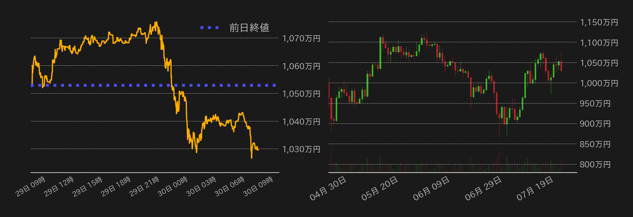 29日のビットコイン(BTC)対円は東京時間に1052万円から一段高となり1070万円を試す展開となった。週末にはトランプ前米大統領が、再選の暁にはBTCを米国の準備金にすると発表していた。海外時間のBTC円はジリ高が続き、米時間序盤には70,000ドル水準(≒1075万円)にワンタッチ。すると、利益確定の売りが入り、相場は上げ幅を掻き消した。その後、相場はドル建てBTCの下降チャネル下限が位置する68,000ドル水準(≒1045万円)で一時下げ止まるも、米政府のアドレスから約2.98万BTC(≒3053億円)の送金が確認され、1030万円近辺まで水準を切り下げた。米市場引けにかけてのBTC円は1040万円周辺まで戻すも、この日の終値にかけて弱含み、1030万円を僅かに下回って引けた。