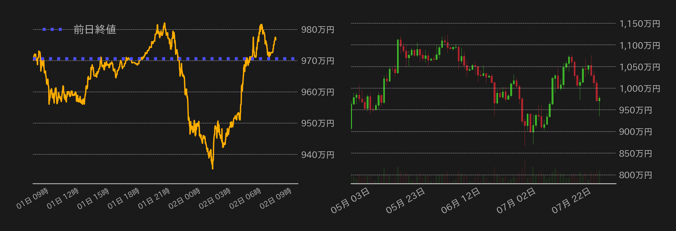8月1日のビットコイン(BTC)円は970.5万円から売り優勢で取引が始まり、東京時間は概ね960万円周辺で揉み合いとなった。終盤にかけては買い戻され、欧州時間にはドル円相場の揺り戻しを受けて980万円近傍まで戻したが、改善すると予想されていた7月の米ISM製造強景気指数(PMI)が悪化したことで、想定以上に早いペースで景気が減速しているとの懸念が台頭した他、中東情勢の悪化でこの日の米株市場は急落、BTCも連れ安となり米時間序盤にかけて相場は930万円台まで水準を下げた。一方、その後は米長短金利差がフラット化するなか底堅く推移すると、引け後のコインベースの決算上振れを受けて米時間の下げ幅を奪回した。