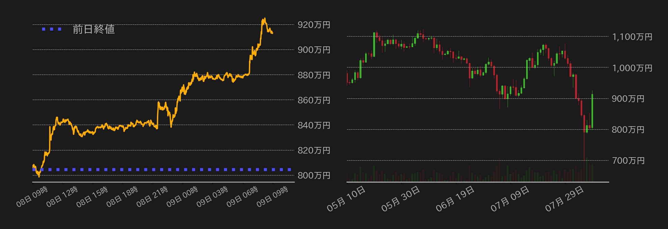 8日のビットコイン(BTC)円は+10%を超える大幅高となり、終値は910万円を回復した。前日に米SEC対米リップル社の裁判で前日に裁判所がリップル社に対して有利な判断をしたことで、この日のBTC円はXRPの上昇に連れ高で東京時間に800万円周辺から840万円台に浮上した。その後は840万円周辺で揉み合う展開が続いたが、前週の米新規失業保険申請件数が大幅に下振れると、米時間序盤にかけて880万円周辺まで上昇。今朝方にはショートカバーを伴って一時925.3万円まで戻し、終値では60,000ドル水準となる883.6万円や、先月29日からの下落の半値戻し887.8万円を回復した。
