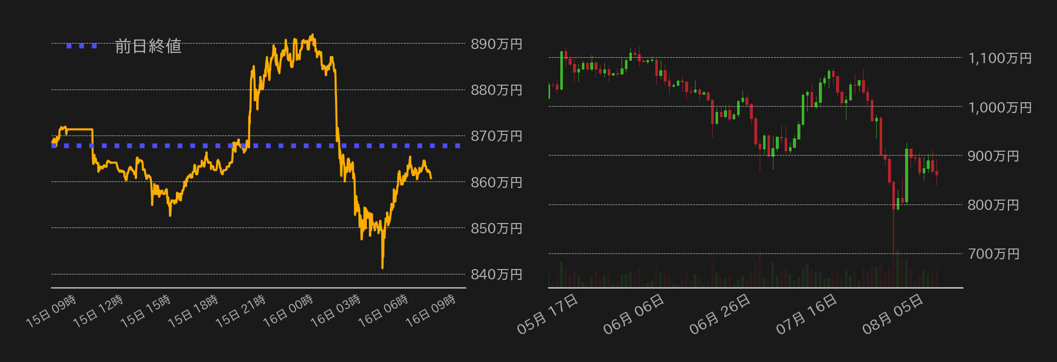 15日のビットコイン(BTC)円は867.6万円から取引を開始すると、東京時間は前日の売りの流れが続きジリ安に終始し、852.5万円まで押した。その後、欧州勢参入と共に相場は切り返すと、7月の米小売売上高が大幅に上振れ(予想:+0.3%→結果:+1%)、米景気後退懸念が一層和らぐなか、890万円周辺まで戻した。一方、これにより相場は60,000ドル水準(≒894.1万円)に肉薄し上げ渋っていると、米時間後半からは戻り売りが加速し、相場はロングの投げを伴って反落、一時は840万円まで押された。米市場引け後には買い戻しが入ったが、終値はプラス圏回復に僅かに及ばず、860.7万円となった。