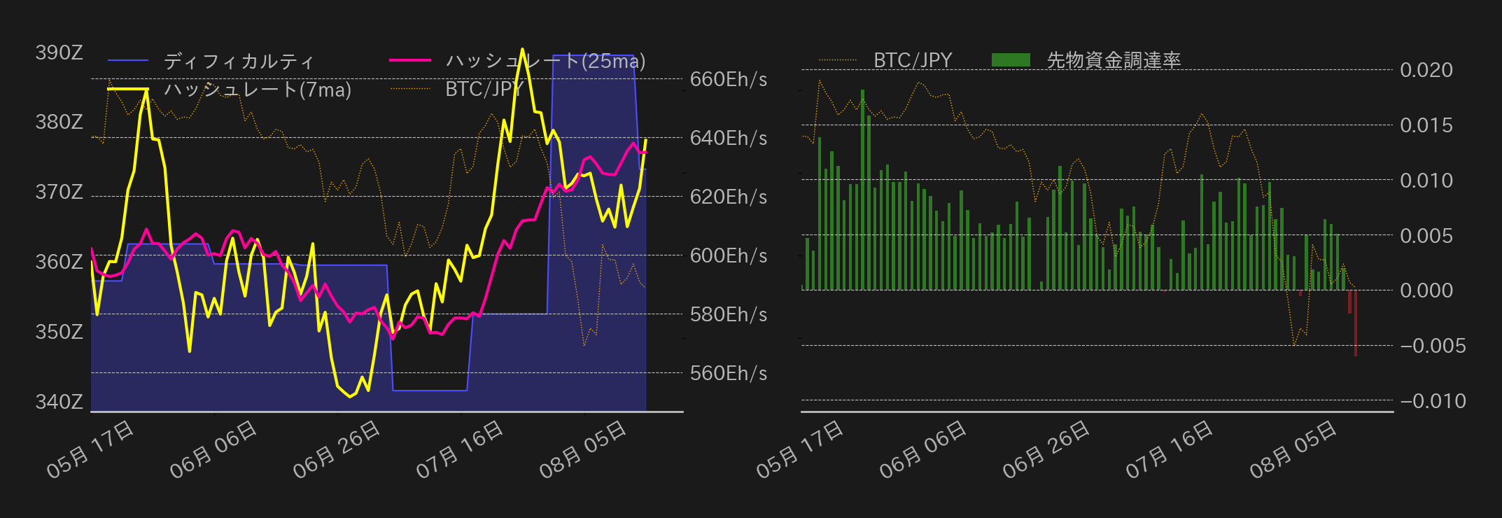 米小売売上高は予想以上の伸びとなり、FF金利先物市場ではFRBによる9月の大幅利下げ観測が更に後退したが、昨日は米株や金(ゴールド)が上昇しており、BTC相場下落のカタリストとなる明確な材料は見当たらなかった。8月に入ってFRBによる9月の利下げがほぼ確実となるなか、景気後退への懸念は徐々に解消し、リスクアセットには追い風が吹く一方で、まちまちなETFフローから鑑みてもボラティリティの高いBTCは順番待ちと言ったところか。ただ、昨日も指摘の通り、BTC先物の需給の偏りによって相場の下値は限定的となっている。昨日は資金調達率が5月ぶりの水準まで低下しており、本日も底堅い値動きが続くだろう。