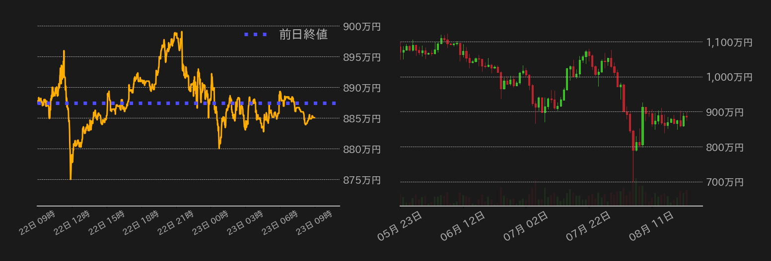 22日のビットコイン(BTC)円は887.4万円で取引を開始すると、東京時間序盤から利益確定の売りに押され、875万円まで下落した。その後、相場は売り一巡で反発すると、米株先物の上昇につれて海外時間には900万円近傍まで戻したが、米時間に入ると885万円周辺まで押し返された。この日は23日のジャクソンホール会議でのパウエル米連邦準備理事会(FRB)議長の講演を控え、米市場ではポジション調整の動きが目立ち、前日の米国債高(金利は低下)や株高が反転、BTC円も上値を重くした。しかし、相場は始値周辺で下げ止まり、終値は885万円。ドル建てでは節目の60,000ドル(≒877.1万円)を維持した。