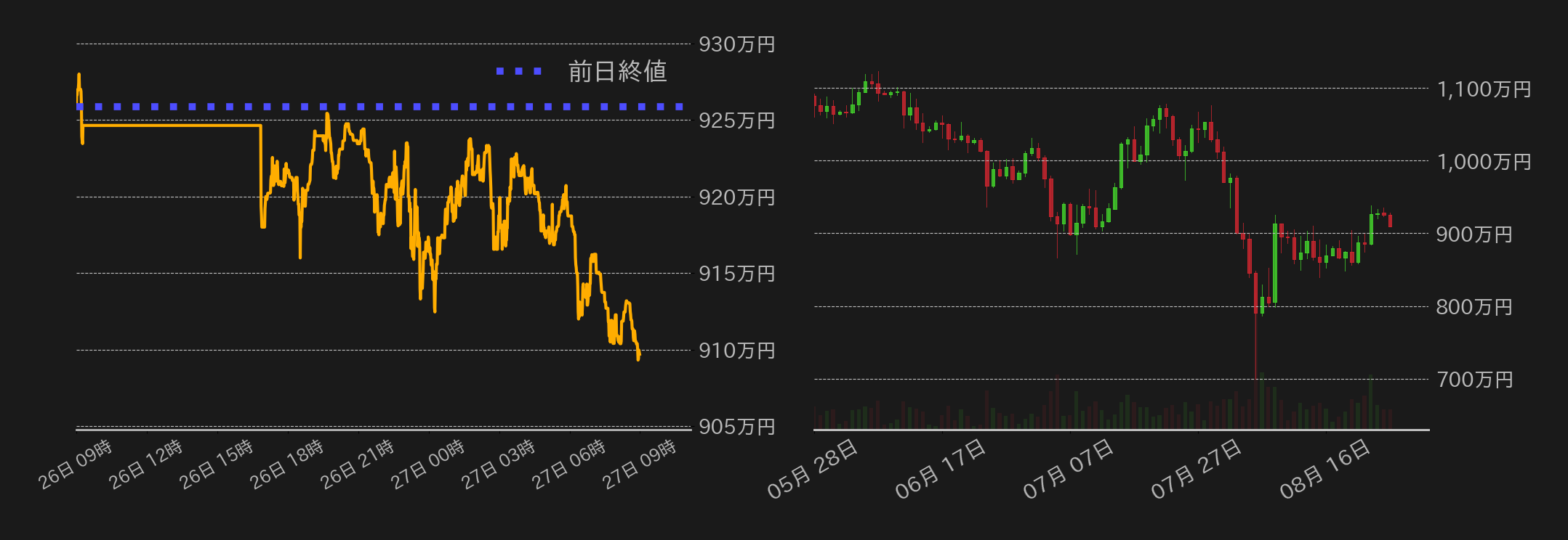26日のビットコイン(BTC)円は925.8万円から取引が始まった。今週はシカゴマーカンタイル取引所(CME)のBTC先物が下に窓を開けて取引を始めたことで、東京時間の相場は小甘い地合いとなった。窓埋め達成後の相場は920万円周辺での揉み合いに転じ、海外勢参入後には底堅い推移となった。一方、その後発表された7月の米耐久財受注がまちまちな内容になったことや、エヌビディアの決算を控えて米株式市場でポジション調整ムードが広がり、米時間からのBTC円は下げ幅を拡大した。米市場の引け後には、相場は週末の狭いレンジを下抜け、終値は910万円を僅かに下回った。