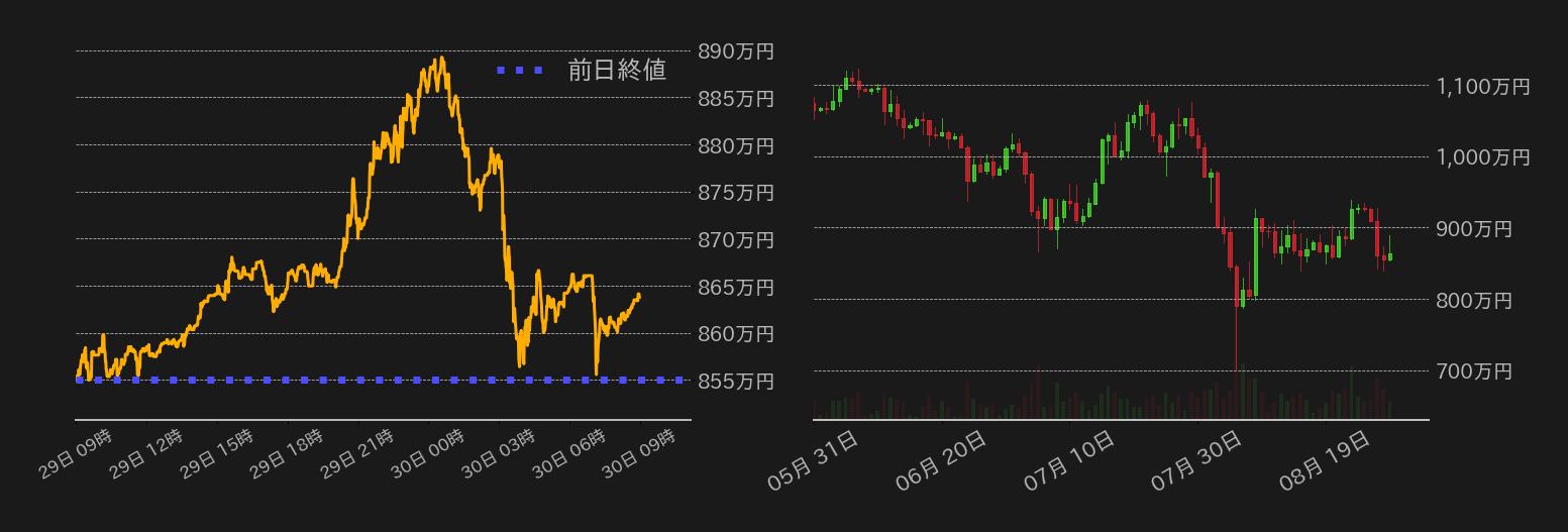 29日のビットコイン(BTC)円は上下に振れつつも方向感に欠ける展開。この日の相場は855.1万円で取引を開始すると、東京時間終盤から小締まる展開となり860万円台後半に戻した。米時間には、第二・四半期の米GDP成長率改定値が上方修正されたことで景気後退懸念が和らぎ、BTC円は890万円に肉薄したが、これによりシカゴマーカンタイル取引所(CME)のBTC先物が窓埋めを達成し戻り売りが入った。さらに、米国市場終盤にかけての米株の反落に連れ安となり、相場は上げ幅の殆どを掻き消し、終値は863.7万円となった。