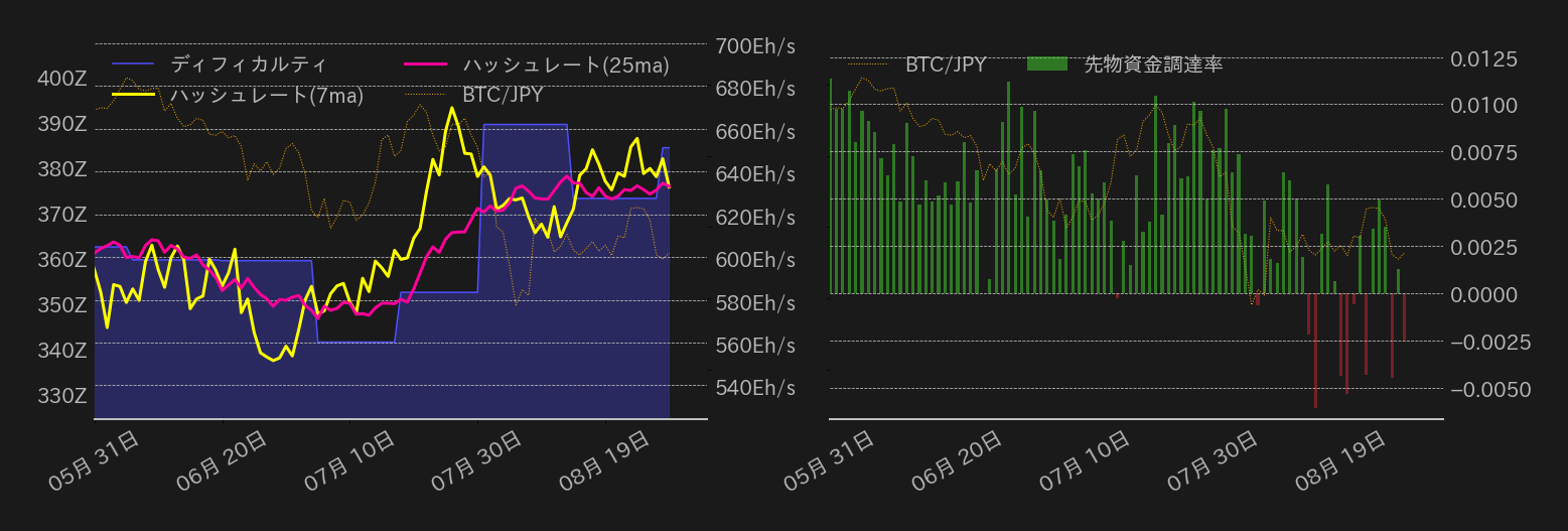 先週のジャクソンホールを通過して900万円を回復していたBTC円だったが、先物市場で過熱感がでたところにエヌビディアの決算や重要経済指標への警戒感が相場の重石となり、今週はロングの投げを伴って先週の上げ幅を吐き出した。エヌビディアの決算は利益と収入が予想を上回ったものの、見通しが期待を上回る内容ではなく、同社の株価及びナスダック総合を圧迫している。他方、米国の景気が底堅さを示していることでBTCは800万円台中盤で下げ止まっているが、市場ではFRBによる大幅利下げ観測が修正されつつある。本日発表される7月の米PCE価格指数では、前年比でインフレの若干の加速が予想されており、結果が市場予想通りとなれば、大幅利下げ観測の修正がさらに進み、BTC円には重石となる可能性がある。