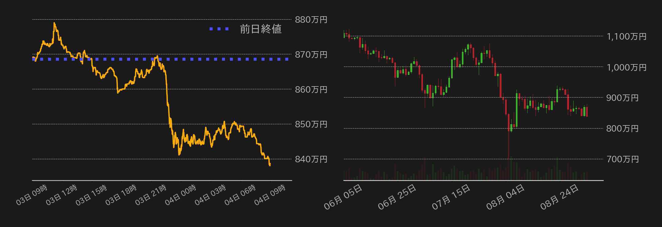 3日のビットコイン(BTC)円は反落し、週明けの上げ幅を吐き出した。イスラエル国内で停戦を求めるデモが起きたことや、英国がイスラエルへの武器輸出を停止したことなどを受けたガザ地区の停戦期待が週明けのBTC円の支援となり、相場は800万円台後半に戻していたが、この日はドル建てBTC相場が一目均衡表の雲上限(59,837ドル≒879万円)にタッチすると失速。米時間に入ると、全米供給管理協会(ISM)が発表した7月の製造業PMIが市場予想を下回る結果となり、景気後退への懸念が再燃し、BTC円は下げ足を速め850万円を割り込んだ。本日はアジアの株式市場にもリスクオフムードが波及し、BTCは海外の取引所で一時55,555ドル(≒800万円)まで値を下げている。