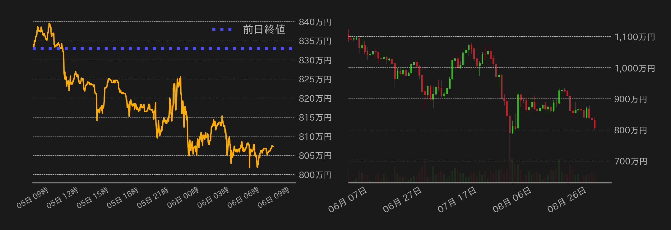 5日のビットコイン(BTC)円は832.9万円で取引を開始。東京時間には、FRBが暗号資産(仮想通貨)に友好的な米ユナイテッド・テキサス銀行に業務停止命令を下したことが嫌気され、BTC円は820万円近辺まで下落。欧州勢参入後も上値の重い展開が続き、相場は815万円まで水準を下げた。その後発表された8月のADP雇用レポートでは、民間部門雇用者数が+9.9万人と3年半ぶりの低水準となり、BTC円は810万円にタッチ。その後相場は825万円まで揺り戻したが、本日発表される米雇用統計を控え警戒感が広がり反落した。米市場引け後もBTC円は上値の重い展開が続き、終値は807.3万円で引けた。