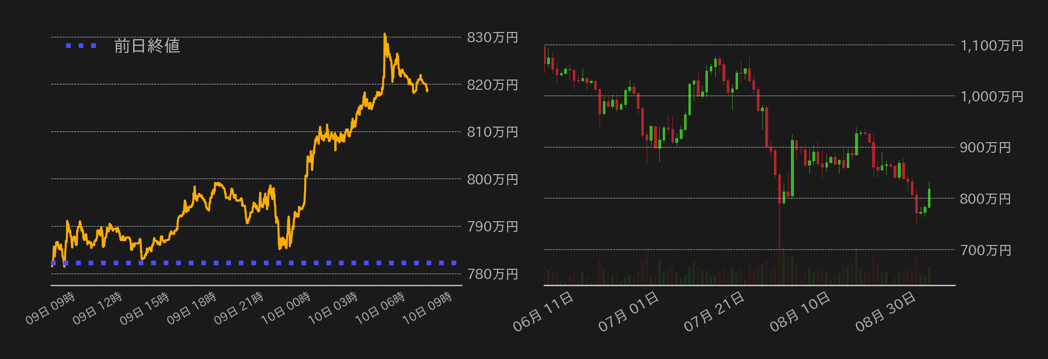 9日のビットコイン(BTC)円は782.2万円から取引を始めると、東京時間は動意に欠ける展開が続いた。終盤から欧州時間序盤にかけてはやや小締まる地合いとなり、相場は800万円を試したが、米時間序盤には上げ幅を解消した。一方、その後は米主要株価3指数が反発するなか、BTCにも安値拾いの買いが広がると、ショートカバーを伴って相場は上値を追う展開に転じた。今朝方には、BTC円は目先の上値目途と指摘した58,000ドル(≒832万円)にワンタッチし失速。終値はやや水準を下げ、818.7万円となった。