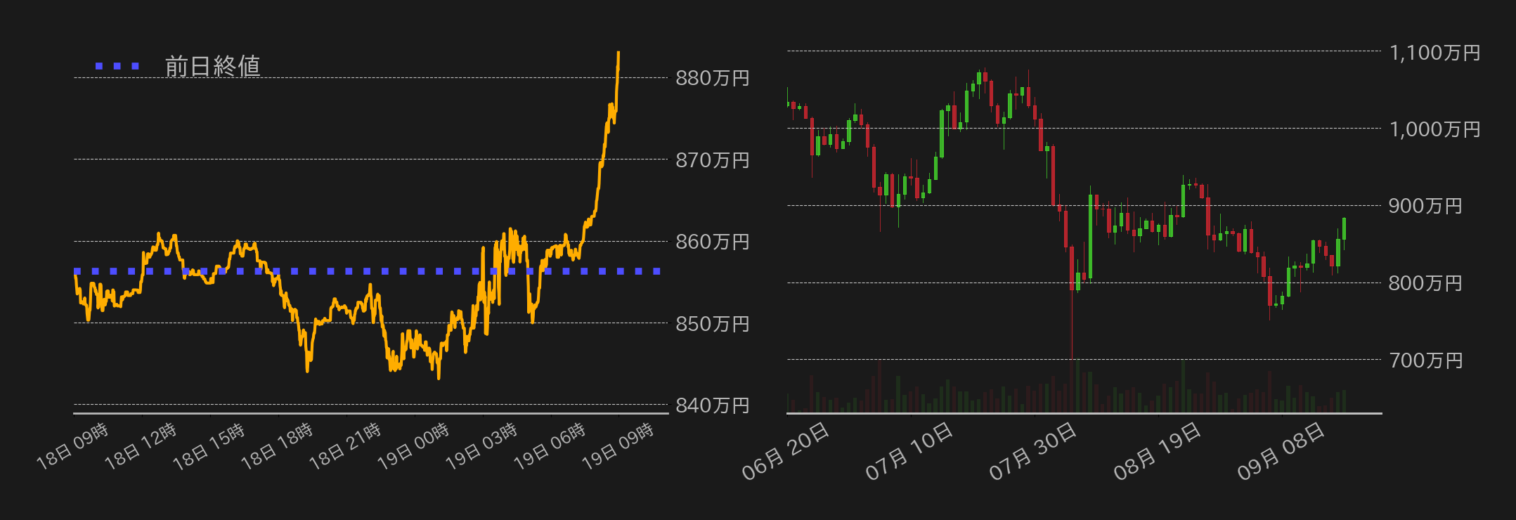 18日のビットコイン(BTC)は856.3万円から取引を開始した。東京時間の相場は方向感を失い小幅揉み合いに終始。欧州勢が参入すると弱含みに推移し840万円台前半まで水準を下げたが、米連邦公開市場委員会(FOMC)の結果を前に再び揉み合いに転じた。FOMCでは50bpの利下げが決定され、直後のBTC円は振れ幅を伴って上下するも、パウエル米連邦準備理事会(FRB)議長が記者会見で景気後退の兆候を否定した他、インフレ目標達成に自信を示すと、相場は今朝方から上昇に転じ、880万円を回復。終値は883万円で3週間ぶりの高値となった。