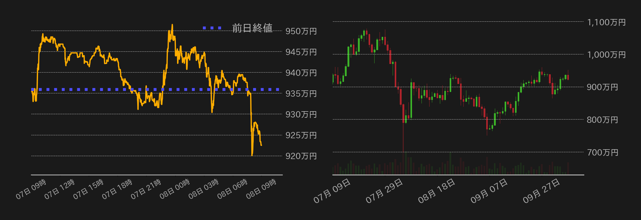 7日のビットコイン(BTC)対円は935.9万円から取引を開始。東京時間序盤には950万円近辺まで一段高を演じるも、その後は失速した。欧州時間に入ると米株先物の下落に連れ安となり、上げ幅を掻き消したが、米時間序盤には予測市場のポリマーケットでトランプ氏の勝率予想が急上昇し、BTCは952.1万円まで水準を戻した。しかし、イスラエルによる対イラン報復が差し迫っているとの一部報道や、FRBによる市場の大幅利下げ観測が後退する中、相場は高値を維持できず、米国市場終盤には再び上げ幅を解消。今朝方にはFTXの再建計画が米連邦破産裁判所に承認されたとの報道を受けさらに水準を下げ、終値は922.5万円となった。
