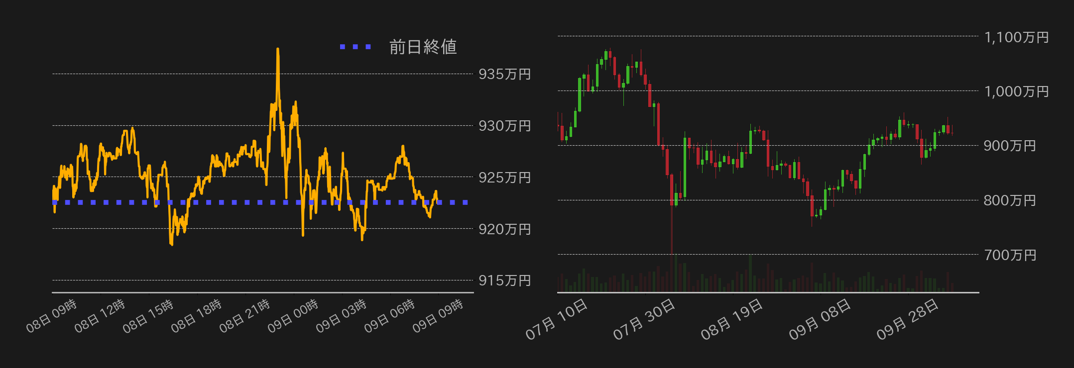 8日のビットコイン(BTC)対円は922.5万円から取引を開始。東京時間の相場は手掛かり難で小幅な揉み合いに終始し、方向感に欠ける展開となった。欧州勢参入後には920万円まで水準を下げるも、その後は小締まる地合いとなり底堅く推移した。一方、米国時間に入るとBTCは米株の上昇に連れ高となり一時は937.4万円まで上昇。しかし、FRBによる大幅利下げ観測が後退する中、直後には上げ幅を解消し、振れ幅を伴いつつもやはり方向感を示せなかった。結局、この日の終値は前日比0.01%安の922.4万円とほぼ変わらず、終値ベースでは週末から925万円周辺での揉み合いが続く形となっている。
