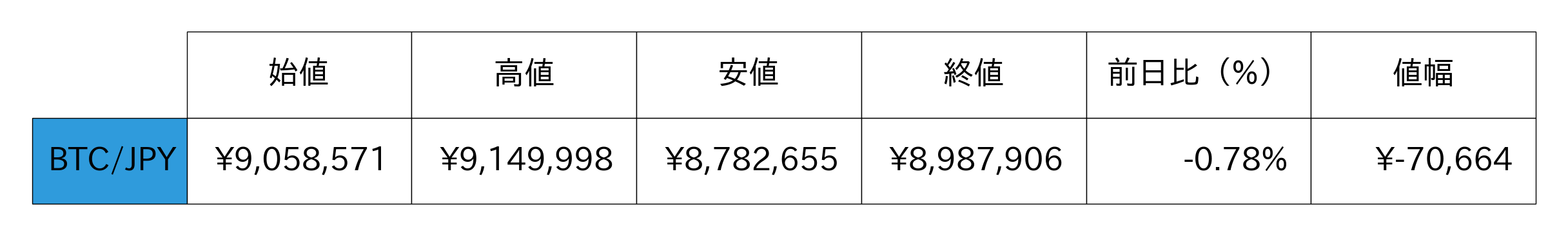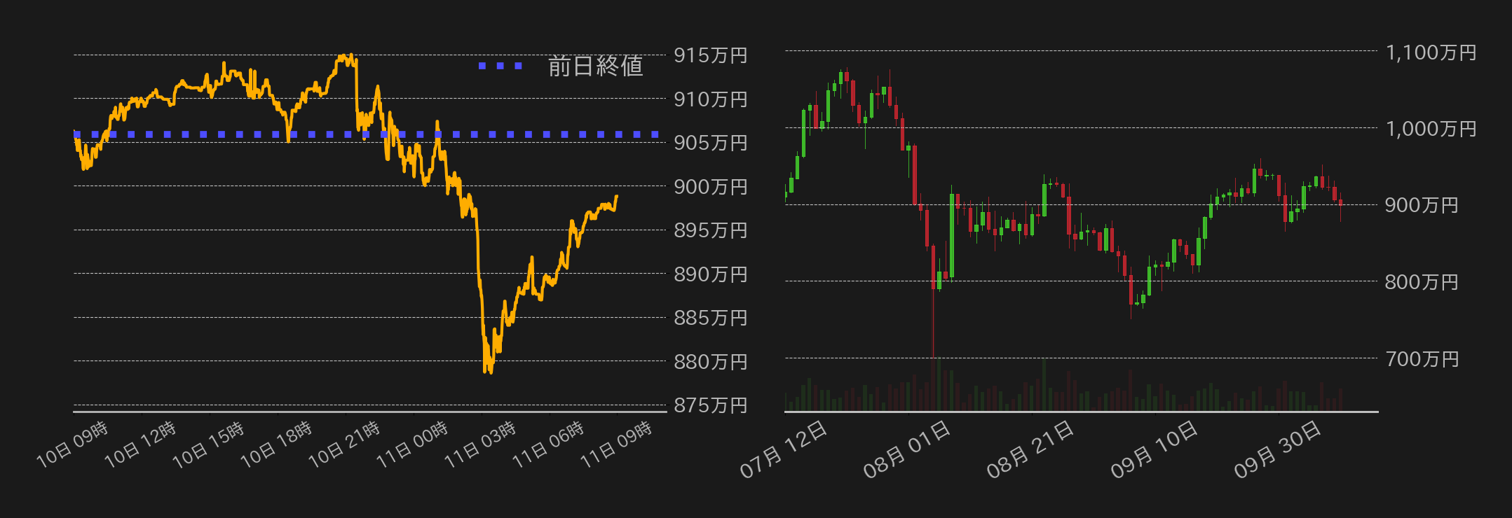10日のビットコイン(BTC)円は905.8万円から取引を開始。前日の下げが一服し、東京時間のこの日の相場はジリ高に推移し、終盤には914万円周辺まで戻したが、9月の米消費者物価指数(CPI)を控え、欧州時間に入ると失速した。米CPIは前年比+2.4%と前月の+2.5%から減速したものの市場予想をやや上回った。また、米新規失業保険がおよそ3年ぶり高水準となりBTCは弱含みに推移すると、米アトランタ連銀ボスティック総裁が利下げを見送る可能性に言及し、米国時間中盤の相場は878.2万円まで水準を下げた。一方、米30年債入札で需要が堅調だったことで、その後の利回りの低下も支援となったからか、終盤から今朝方にかけてBTCは下げ幅を縮小。終値は898.7万円となった。