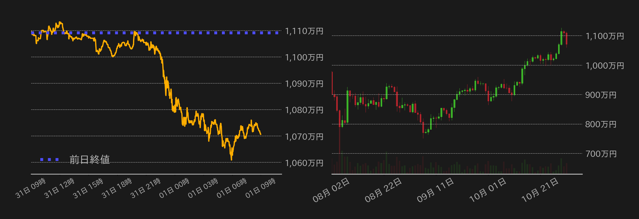 31日のビットコイン(BTC)円は1109万円から取引を開始した。9月の米個人消費支出(PCE)価格指数の発表を控え材料まちとなる中、東京時間の相場は1110万円周辺での小幅な揉み合いに終始。海外時間に入ると1100万円までやや水準を下げるも、底堅い推移が続いた。一方、米国時間序盤に発表されたPCE価格指数は、前年比で継続的な鈍化を示したものの、コア指数は市場予想比で上振れ、BTCは下値を模索する展開に転じた。米国市場引け後には、相場は一時70,000ドル(≒1064万円)周辺まで下落したが、節目の水準で買い支えられ、終値は1070.6万円となった。