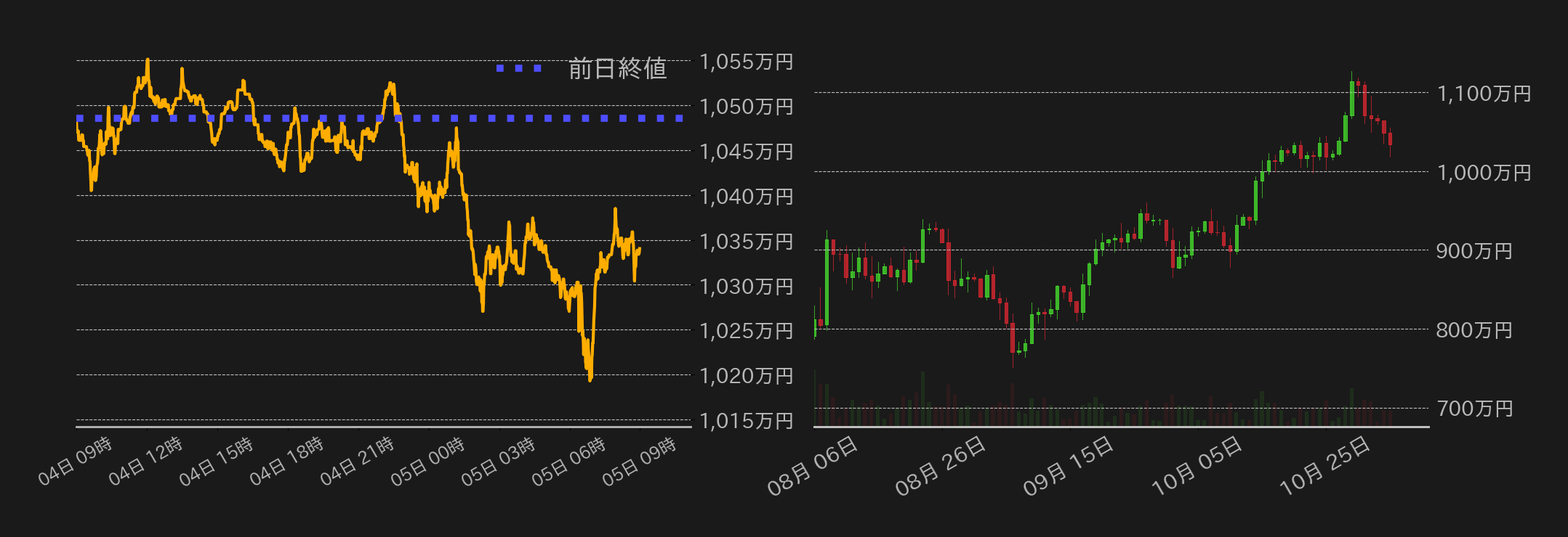 4日のビットコイン(BTC)円は1048.5万円から取引を開始。本日米国で投開票が始まる大統領選挙を控え、東京時間から欧州時間中盤にかけては前日の終値を挟み込み小幅な揉み合いに終始した。一方、大統領選直前に世論調査や予測市場で共和党候補のトランプ氏が圧勝する可能性が後退する中、トランプトレードの巻き戻しが発生し、米国時間のBTC相場は下げに転じ、終盤には1030万円近辺まで水準を落とした。今朝方には一時1018.2万円まで下落するも、その後は買い戻され、終値は1034万円となった。