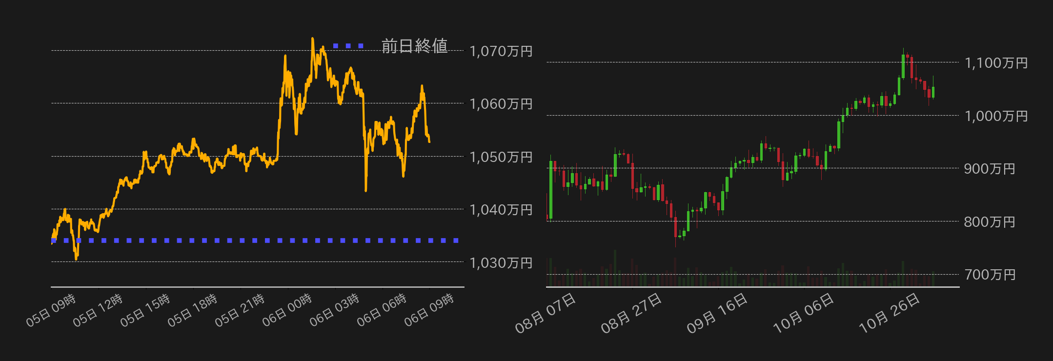 5日のビットコイン(BTC)円は1034万円から取引を開始した。前日まで6日続落していたBTC円は、東京時間に下げ渋ると、予測市場のカルシーで米大統領選におけるトランプ氏の勝率が投開票を目前に上昇したのを眺め、1050万円周辺まで反発した。海外勢参入後には、相場は1050万円での揉み合いに転じたが、米国時間序盤にはトランプ氏の再選が意識されたからか1070万円近辺まで上昇。その後発表された米供給管理協会(ISM)のサービス業PMIが堅調だったことで米株の上昇も相場の支援となり、一時は1074.3万円まで上値を伸ばした。今朝方には、米国時間の上げ幅を掻き消す場面もあったが、ドル建てで2021年高値の69,000ドル水準(≒1046.9万円)で下げ止まり、終値は1052.6万円となった。