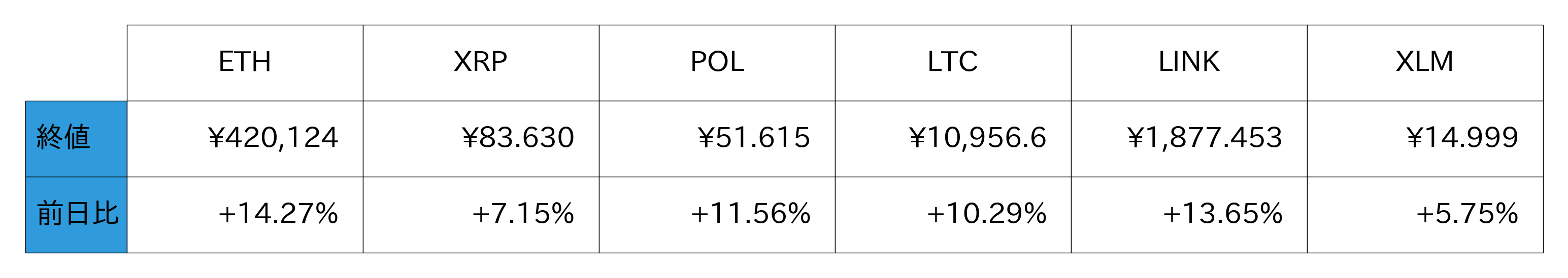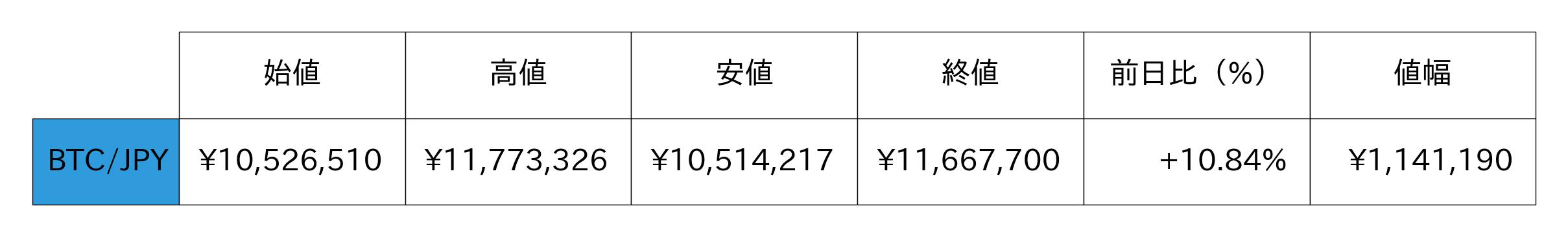 6日のビットコイン(BTC)円は1052.6万円から取引を開始。米大統領選で激戦区ペンシルベニア州での出口調査においてトランプ氏がハリス氏に僅差でリードを獲得したとの報道を受け、東京時間は上値を追う展開で始まると、BTCはドル建てで史上最高値を更新し、75,000ドル(≒1157.8万円)にタッチした。終盤にはノースカロライナやジョージアでの同氏の勝利が確定し、相場は一時1160万円まで上昇するも、選挙戦におけるトランプ氏の勝利が確実となると、やや事実売り気味に相場は失速した。一方、米国時間に入ると株式市場の上昇が追い風となり、BTCは復調。今朝方には一時76,000ドル水準(≒1173.2万円)に乗せ、終値は1166.7万円となった。