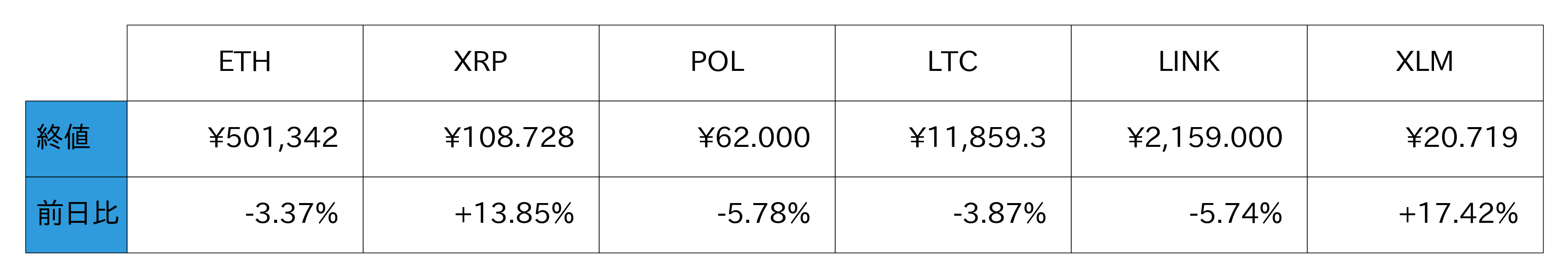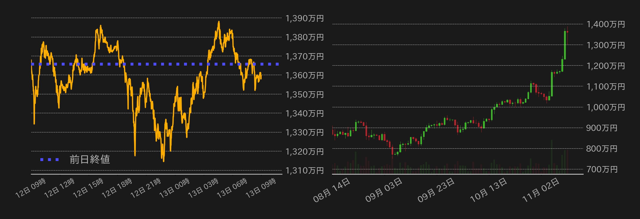 12日のビットコイン(BTC)円は1365.7万円から取引を開始した。東京時間は揉み合いつつも徐々に水準を切り上げドル建てで節目の90,000ドル水準(≒1387.6万円)を試す展開となったが、終盤にかけては上げ渋っていると、海外勢参入後にはトランプトレードの一服感も相まって下げに転じた。その後、相場は節目の1300万円で買い戻されるも、米国時間序盤には米株の軟化が相場の重石となり、1300万円台前半での揉み合いに転じた。一方、米国時間中盤からの相場は粘り腰を発揮し、一時は90,000ドル水準に乗せたが、その後はやや水準を下げ、終値は1359.6万円と5日ぶりに反落した。