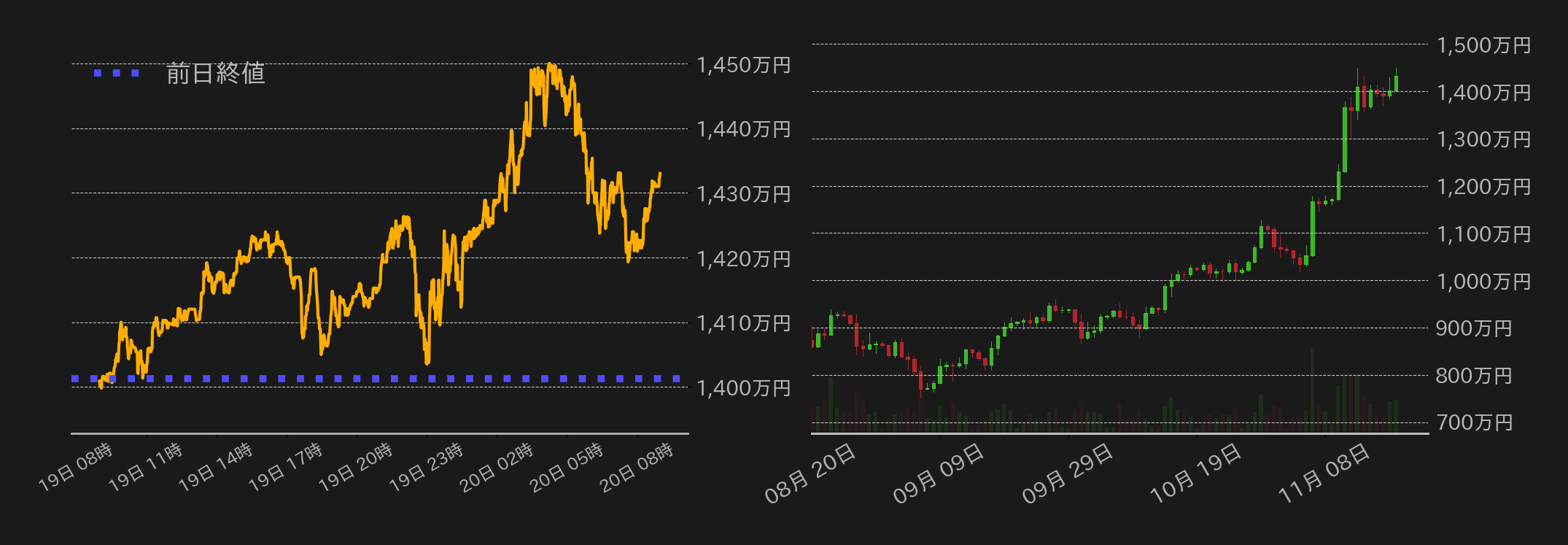 19日のビットコイン(BTC)円は1401.2万円から取引を開始すると、東京時間は強含みに推移し、終盤にはここもとの相場のレジスタンスとなっている92,000ドル水準となる1424万円まで上昇した。欧州時間に入ると節目の水準を背に揉み合いに転じるも、米国時間序盤には上下に振れた後に上昇に転じ、1450万円まで上値を伸ばし、13日の史上最高値1448.9万円を僅かに上回った。一方、これによりドル建てBTC相場が94,000ドルにタッチしたことで、その後は利益確定の売りで反落。米国市場の引け後も上げ幅を縮小する展開は続いたが、終値は1433万円と続伸し、ドル建てでは92,000ドル乗せに成功した。