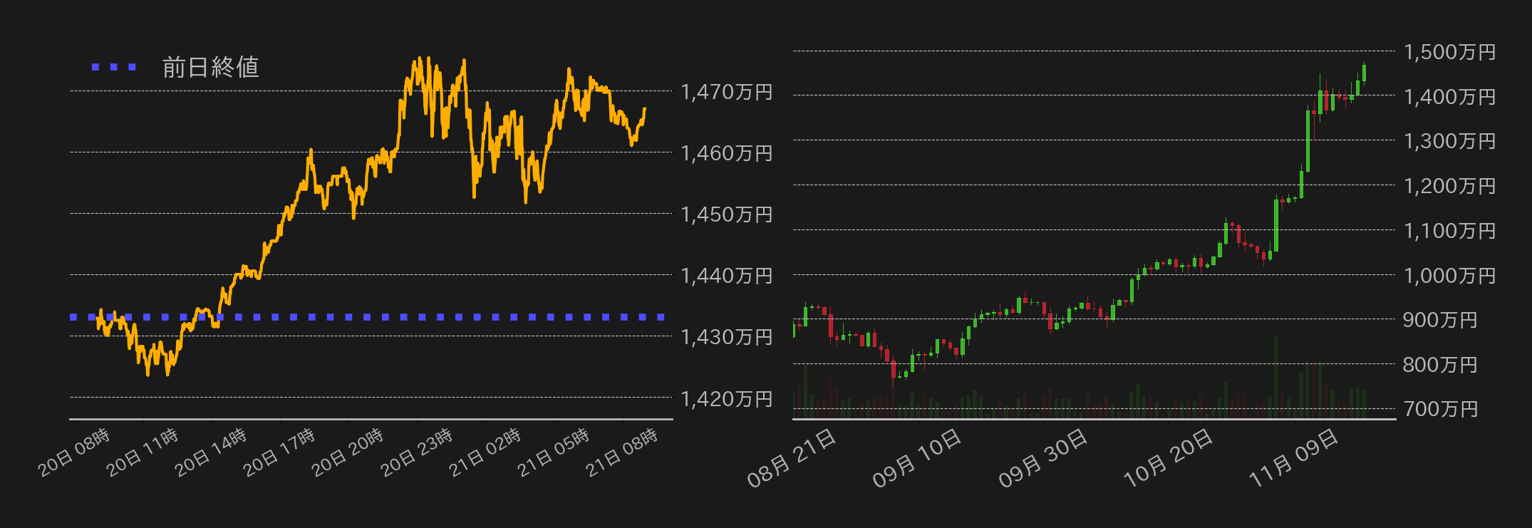 20日のビットコイン(BTC)円は1432.8万円から取引を開始した。東京時間序盤、相場は小動きで始まるも、前日に取引が始まったブラックロックの現物ビットコインETF(IBIT)オプションでコール需要が旺盛だったことを好感して、中盤からは上昇に転じ、ドル円相場の上昇も追い風となり、欧州勢参入後には前日につけた史上最高値1450万円を超えた。米国時間の序盤に相場は更に上値を伸ばし、95,000ドル水準(≒1475.2万円)に肉薄。その後は利食いの様相で上値を重くするも、引け後にエヌビディアが好決算を発表し、米株先物主導で持ち直し、終値は1467万円となった。