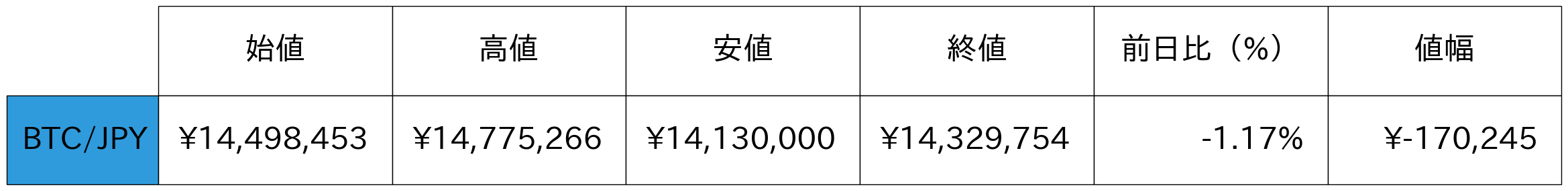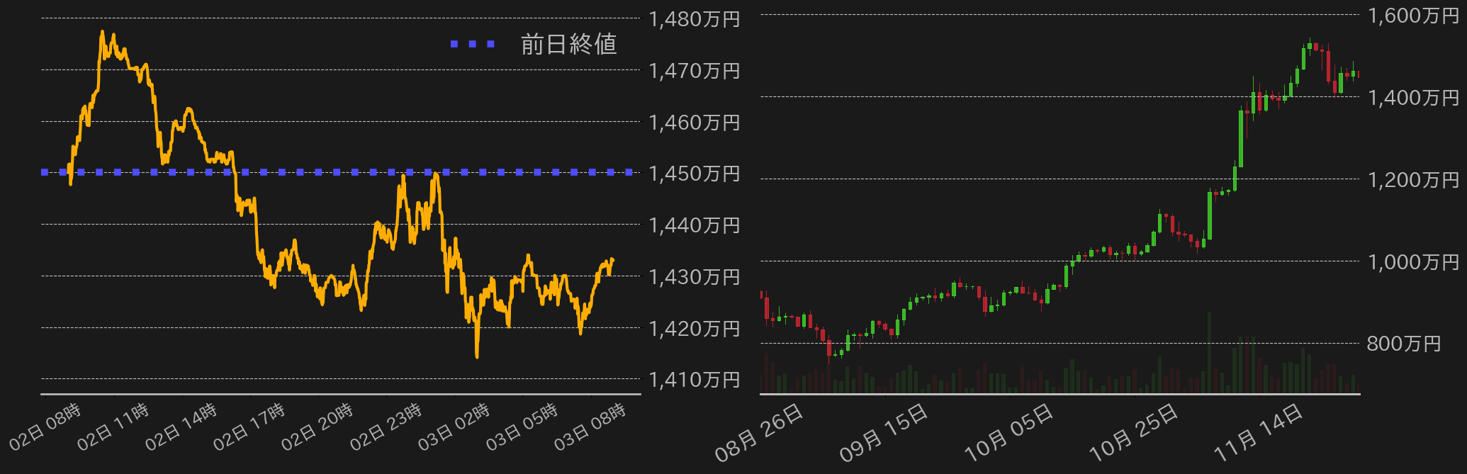 2日のビットコイン(BTC)円は1449.8万円から取引が始まった。東京時間序盤は小高く推移し、1477.5万円まで水準を戻すも、ドル建てBTCが98,000ドル(≒1468.5万円)台に乗せたことで失速すると、中盤にかけて戻り売りが入り上げ幅を解消した。欧州時間序盤にかけても手掛り不足の中売りは続き、95,000ドル水準となる1423万円まで水準を下げたが、米国時間序盤の米株の上昇に連れ高となり1450万円近辺まで戻した。その後、米司法省のBTCアドレスから1.98万BTC(≒2900億円)の送金が確認されたと伝わると、相場は一時1420万円を割り込んだが、95,000ドル以下では安値拾いの買いが入り、下値は堅かった。終値にかけては1430万円を回復し、1432.9万円でこの日の取引を終えた。