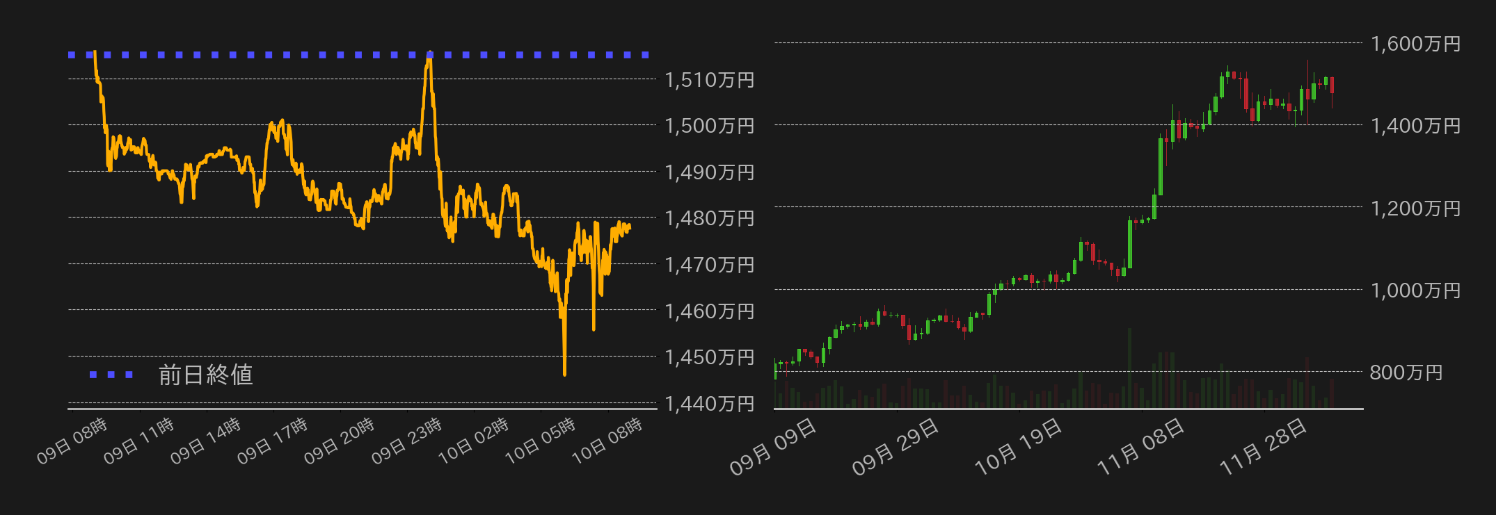 9日のビットコイン(BTC)円は1515万円から売り優勢で取引が始まり、1500万円を割り込み1490万円周辺まで水準を下げた。その後、海外勢参入後も上値の重い展開が続くも、外国為替市場でドル円相場が上昇したことで、円建てBTC相場の下値は支えられた。米国時間に差し掛かると、中国政府の金塊購入再開を受けた金相場の上昇に連動する格好で相場は一時1515.8万円まで戻すも、中国でエヌビディアに対する独占禁止法違反の調査が始まったことや、米インフレ指標の発表を控え、米株式市場が寄付から弱含むと、BTCも反落し上げ幅を吐き出した。中盤にかけては1840万円周辺で揉み合うも、終盤にかけては下値を模索する展開となり、一時は1440万円まで下落。しかし、その後は押し目買いの様相で反発し、終値では1477.5万円まで水準を戻した。