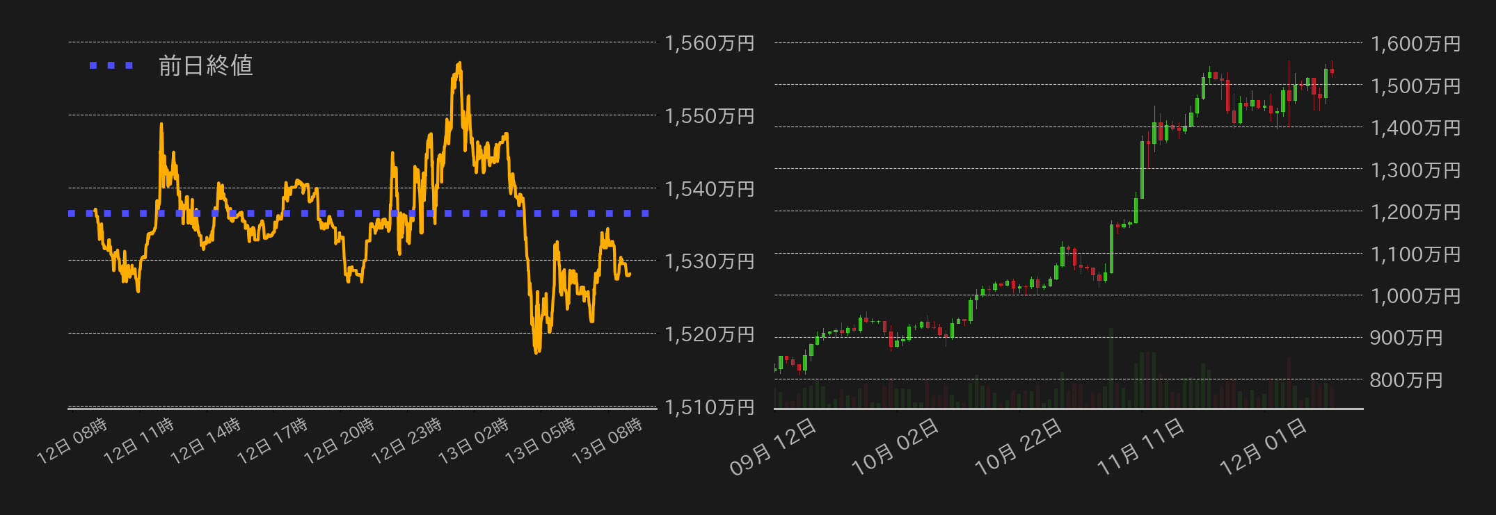12日のビットコイン(BTC)円は1536.4万円から取引を開始。前日の上昇で1500万円を回復し、ドル建てでは大台の100,000ドルに乗せた相場だったが、この日は上げ渋る展開で始まり、東京時間は前日終値を挟み込み小幅な揉み合いに終始した。欧州時間に入ると、相場はやや弱含む場面もあったが、欧州中央銀行(ECB)の追加利下げを受けて切り返した。米国時間朝方に発表された11月の米卸売物価指数(PPI)は市場予想の+2.6%を上回る+3%となったが、失業保険申請件数が予想の+22万件を上回る+24.2万件となり、BTC円は史上最高値の15,571,796円に肉薄した。しかし、その後は伸び悩むと、終盤の米株の軟化に連れ安となり、相場は1517万円まで反落。今朝方にかけては持ち直すも、終値はやや安い1528万円となった。