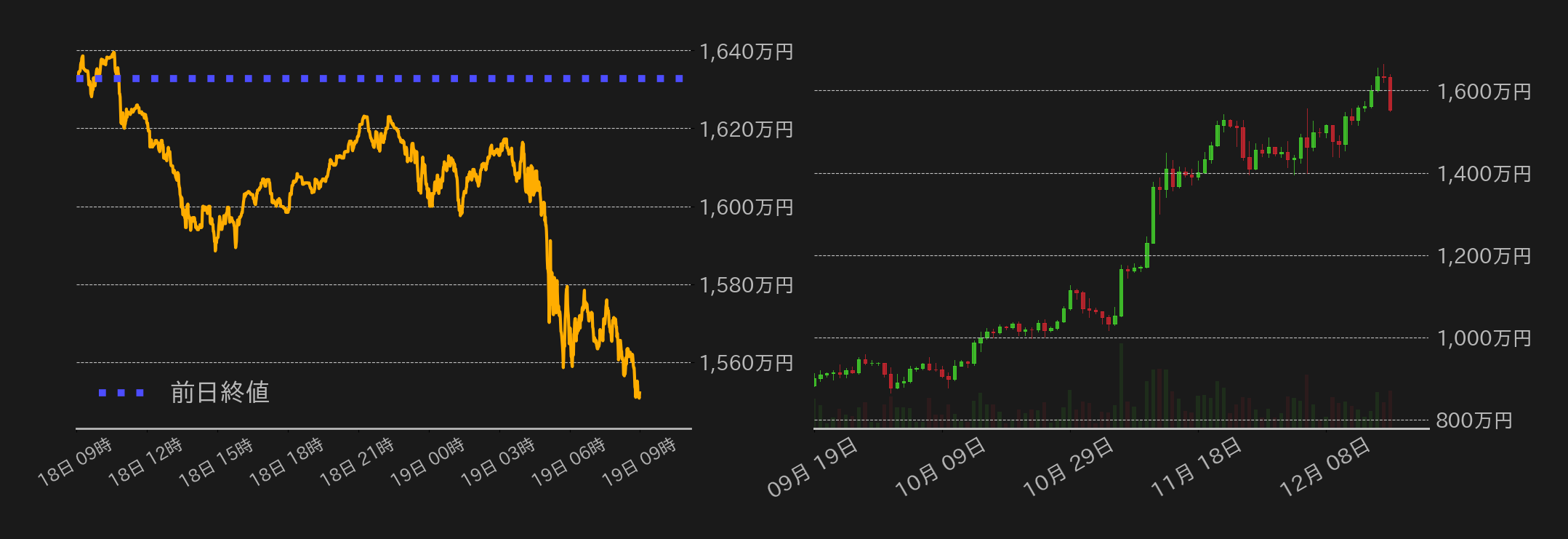 18日のビットコイン(BTC)円は1632.6万円から取引が始まった。この日は米連邦公開市場委員会(FOMC)の最終日となり、相場は東京時間から警戒感で地合いが緩むと終盤には1600万円をやや下回った。欧州勢参入後には1620万円周辺まで揺り戻しとなるも、米国勢参入後には失速し、1610万円を挟み込み小動きに転じた。FOMCは昨日の会合で25bp利下げを決定。市場の予想通り、来年の見通しも2回の25bp利下げ予想が示されたが、中立金利の指針となる長期の見通しが2.9%から3%に引き上げ、来年のインフレ見通しも+2.1%から+2.5%まで大幅に引き上げられた。加えて、パウエルFRB議長は記者会見で、「この先はインフレ進捗を見極めながら慎重に進む必要がある」と、インフレ再燃に警戒感を示し、BTCは1560万円まで一段安を演じた。その後も弱含みに推移し、終値は1552.1万円となった。