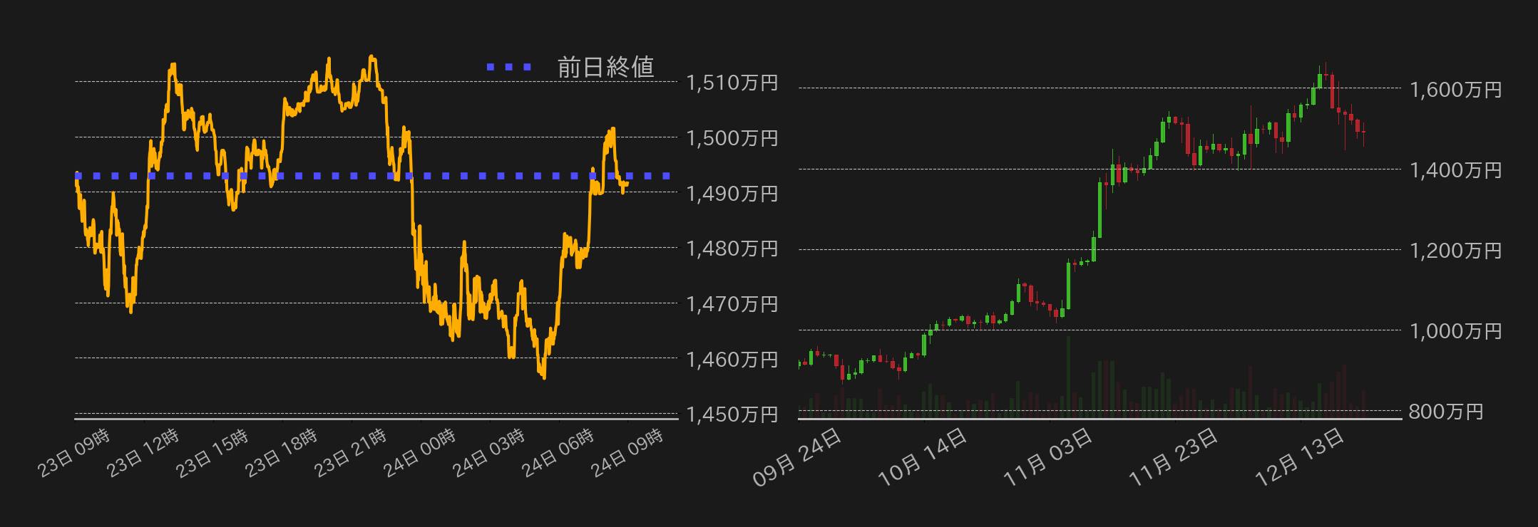 23日のビットコイン(BTC)円は1492.4万円から取引が始まった。東京時間は弱含む展開で始まり、一時は1470万円まで水準を下げるも、売り一巡後に切り返し、終盤には1490万円まで戻した。海外勢参入後も底堅い推移が続き、相場は1510万円を回復したが、米国時間に差し掛かるとアルトターンが発生しBTCは下落。米国市場序盤には米株も軟化し、1470万円周辺まで再び下落した。しかし、その後は薄商いながらも1470万円を挟み込み小幅な揉み合いに転じ、米国市場引け後には反発し下げ幅を解消。年末に差し掛かり市場参加者が減る中、この日は終始チョッピーな値動きとなり、終値はほぼ変わらずの1491.5万円となった。