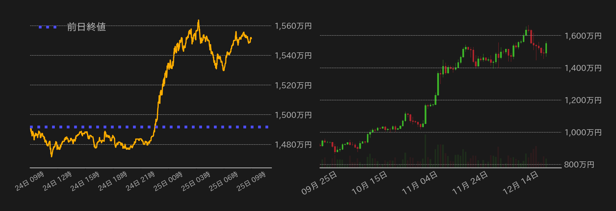 24日のビットコイン(BTC)円は1492万円から取引が始まった。クリスマス休暇で商いが細る中、この日は東京時間に94,000ドル水準となる1480万円周辺に水準を下げると、欧州時間まで取引材料に乏しく小幅な揉み合いに終始した。一方、クリスマスイブで短縮営業となった米国の株式市場では、寄付きから年末アノマリーの「サンタクロースラリー」が発生し、電気自動車大手テスラを筆頭に大型ハイテク銘柄が上昇。するとBTCも俄かに上値を追う展開となり、米国市場の引けにかけて1560万円周辺まで上昇した。その後はやや水準を下げる場面もあったが、終値では1500万円を維持し、1551.2万円でこの日の取引を終えた。