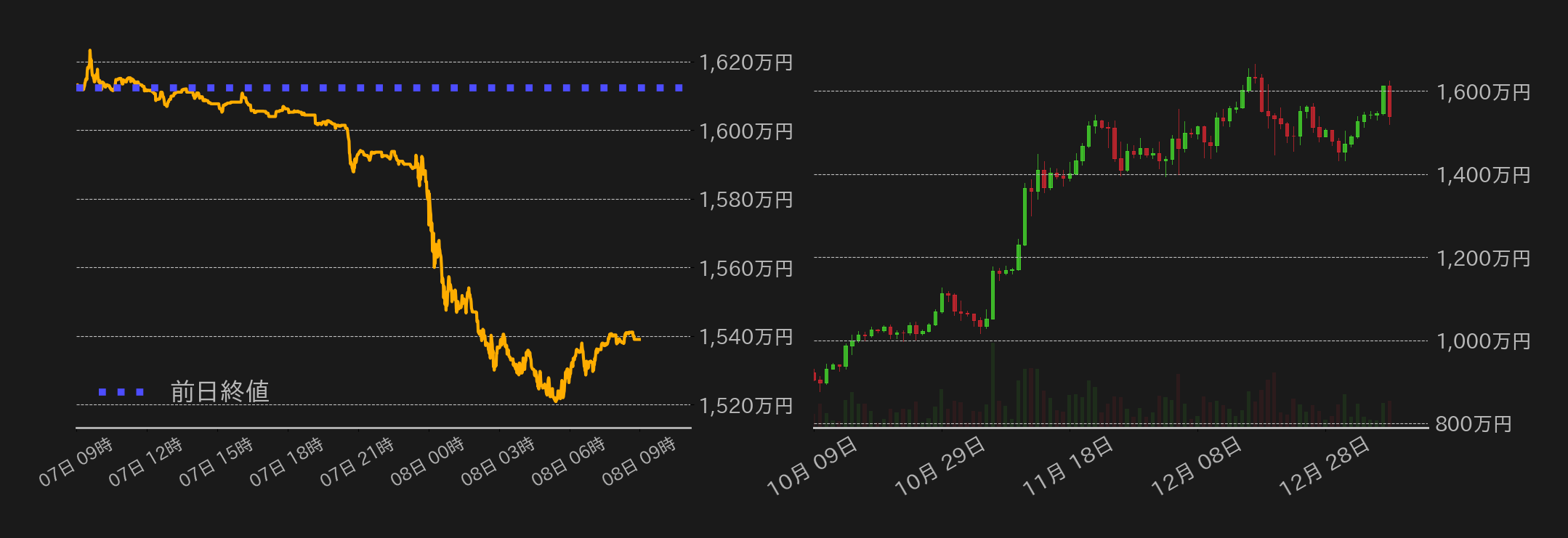 7日のビットコイン(BTC)円は1612万5680円から取引が始まった。前日の相場上昇から東京時間は上げ渋る展開が続くと、ドル円相場が前日の上げ幅を縮小したことで、円建てBTC相場はジリ安に転じ、欧州時間序盤には1600万円近辺まで水準を下げた。その後も小緩む地合いが続き、相場は1590万円周辺まで下落すると、米国時間序盤に発表された11月のJOLTs求人件数と12月のISM非製造業PMIが共に上振れ、米債利回りが急上昇する中、BTCは米株の下落に連れ安となり、ロングの投げを伴って1550万円近辺まで急落を演じた。その後もBTCは弱地合いが続き、米国時間終盤には1520万円周辺で推移。引け後には若干水準を戻したが、相場は前日の上げ幅を完全に吐き出し、終値は1538万9902円となった。
