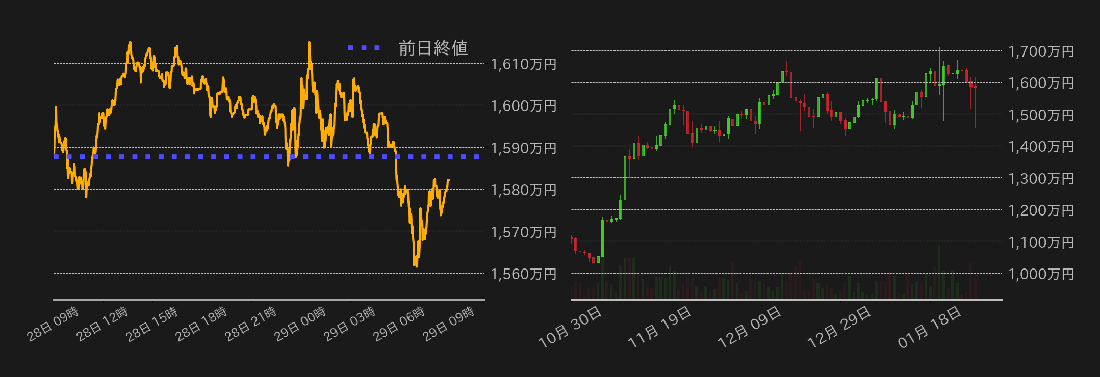28日のビットコイン(BTC)円は1587万6240円から取引が始まった。東京時間序盤は弱含みに推移するも、売り一巡後に切り返し1610万円近辺まで水準を戻した。しかし、これによりドル建てBTC相場が10万3000ドル(≒1602万円)にタッチするとその後は失速し、欧州時間にはジリ安に転じた。米国時間序盤には米株の反発に連れて1610万円台に乗せる場面もあったが、10万3000ドル周辺で再び上値を抑えられ失速。今朝方にはフランスの金融当局がバイナンスに対して資金洗浄と脱税の調査を始めたと報じられると、暗号資産(仮想通貨)は全般的に売られ、BTCは1560万円近辺まで下落した。その後はやや買い戻され、終値は1582万1065円となった。