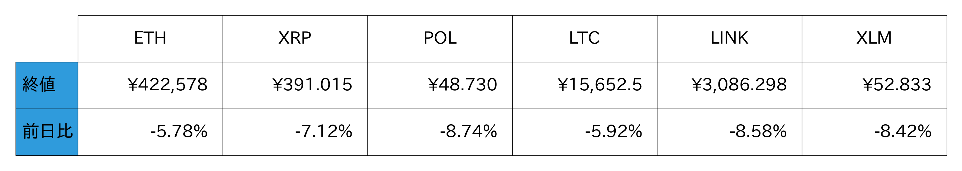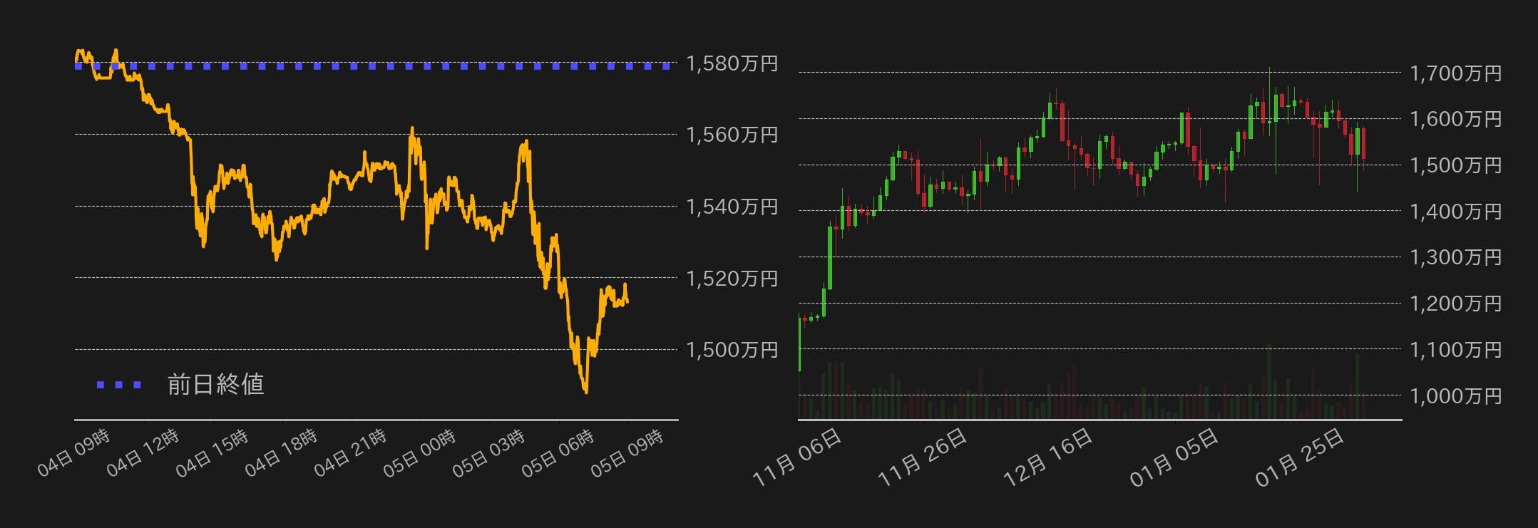 4日のビットコイン(BTC)円は1578万8751円から取引が始まった。前日の上昇が一服し東京時間は上げ渋っていると、中国が対トランプ関税の報復関税を10日から課すと発表し、終盤にかけて1520万円台まで水準を下げた。ただ、10日まで米中間で交渉の猶予があることからその後は下げ止まると、海外時間にかけて底堅い値動きが続いた。今朝方、トランプ政権のAI・暗号資産(仮想通貨)責任者のデービッド・サックス氏が記者会見を開いたが、目新しい材料はなく、失望売りを誘い相場は1520万円割れを試した。米国市場引け後には、売上予想を下回るアルファベットの決算を受けて同社株価が時間外で急落し、BTCも連れて1487万円周辺まで下落。終値にかけてはやや水準を戻し、1513万2331円でこの日の取引を終えた。