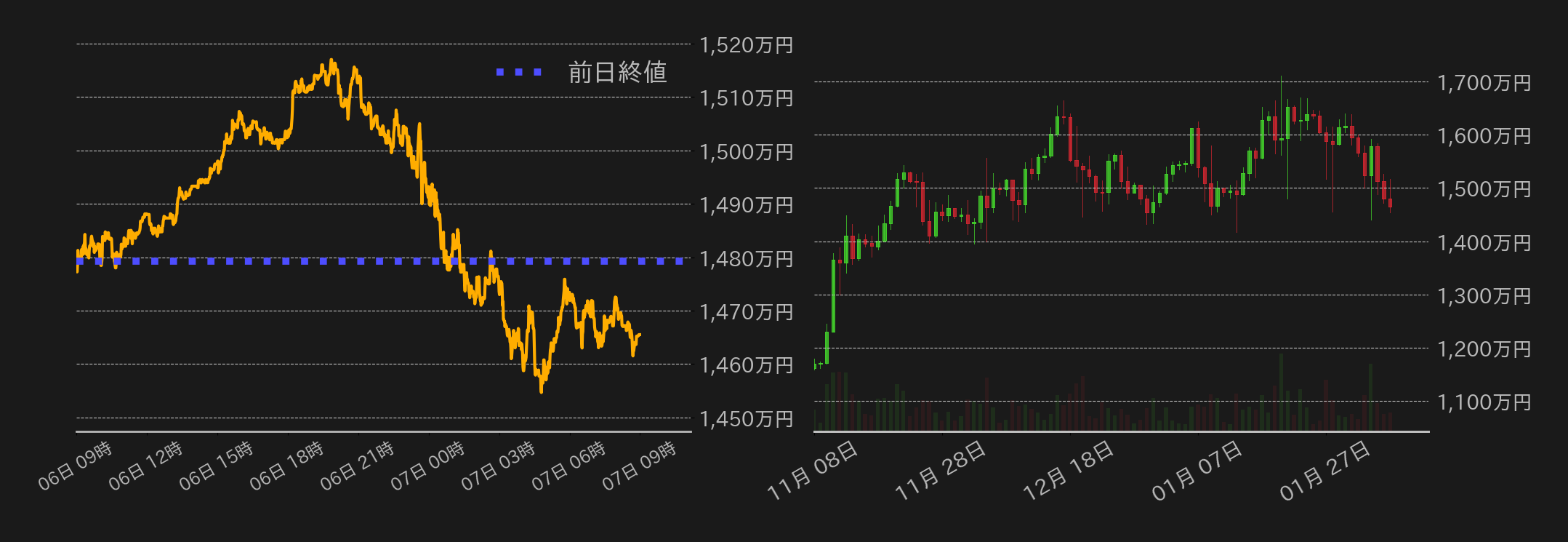 6日のビットコイン(BTC)円は1479万3012円から取引が始まった。前日の下落から売りが一服する中、米連邦預金保険公社(FDIC)の暗号資産(仮想通貨)規制改訂方針が好感され、東京時間の相場は徐々に戻りを試した。欧州時間に入ると1510万円周辺まで戻し、前日の下げを奪回したが、その後は戻り売りが入り上げ幅を縮小。この日の米国時間には、ナスダック総合とS&P500種が上昇したが、BTCの売りは続き、外国為替市場でドル円相場が下落する中、円建てBTC相場の下落には拍車が掛かった。ドル建てBTCの下げ幅は極めて限定的となったが、円建てでは前日の下げ幅を拡大する形となり、米国時間終盤には一時1460万円を割り込む場面もあった。終値にかけてはやや水準を戻し、1465万5082円でこの日の取引を終えた。