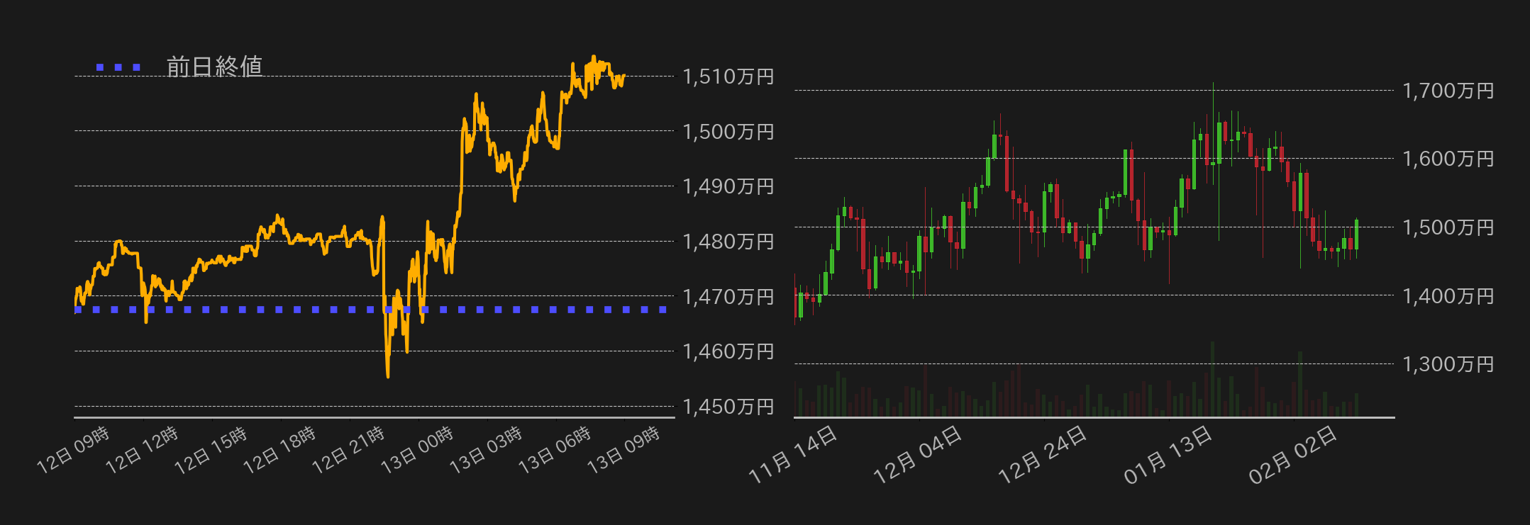 12日のビットコイン(BTC)円は1467万4486円から取引が始まった。1月の米消費者物価指数(CPI)の発表を控え、東京時間の相場は概ね1470万円台での揉み合いに終始すると、欧州時間には小高く推移し1480万円を挟み込む展開となった。米国時間序盤に発表された1月の米CPIは3%上昇と前月の2.9%から加速し、BTCは一時1454万円近辺まで急落を演じるも、トランプ米大統領が「金利を引き下げるべき」と発言すると、相場は俄かに反発し下げ幅を縮小した。更に、パウエル米連邦準備理事会(FRB)議長が議会証言で、FRBは銀行による暗号資産(仮想通貨)顧客へのサービス提供を「阻害したくない」と発言したことや、仮想通貨顧客に対するデバンキングをマニュアルから削除したと発言すると、BTCは1500万円周辺まで一段高を演じた。米国市場引け後も相場は確りと推移し、終値は1510万0001円となった。